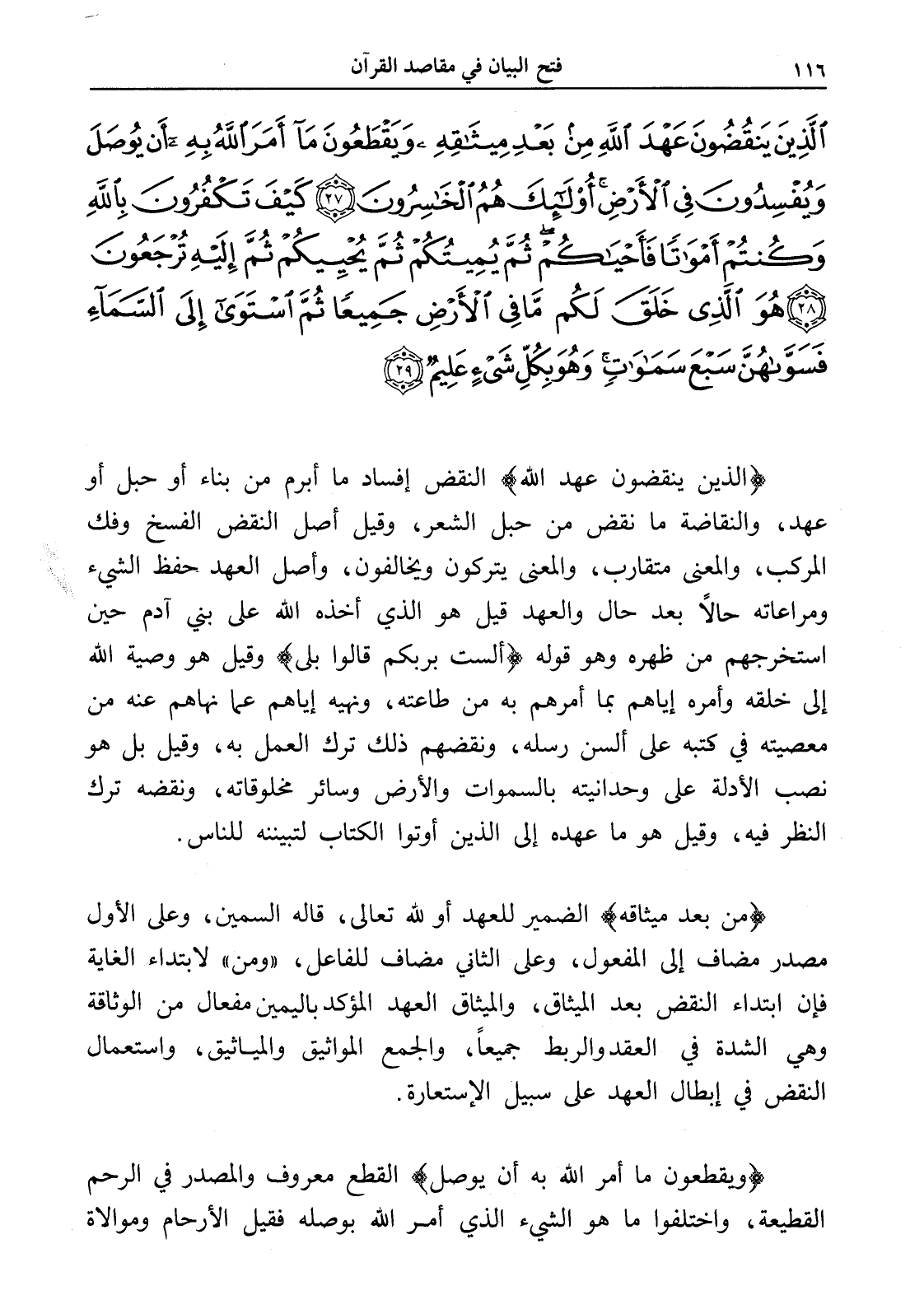 الَّذِينَ يَنْقُضُونَ عَهْدَ اللَّهِ مِنْ بَعْدِ مِيثَاقِهِ وَيَقْطَعُونَ مَا أَمَرَ اللَّهُ بِهِ أَنْ يُوصَلَ وَيُفْسِدُونَ فِي الْأَرْضِ أُولَئِكَ هُمُ الْخَاسِرُونَ (27) كَيْفَ تَكْفُرُونَ بِاللَّهِ وَكُنْتُمْ أَمْوَاتًا فَأَحْيَاكُمْ ثُمَّ يُمِيتُكُمْ ثُمَّ يُحْيِيكُمْ ثُمَّ إِلَيْهِ تُرْجَعُونَ (28) هُوَ الَّذِي خَلَقَ لَكُمْ مَا فِي الْأَرْضِ جَمِيعًا ثُمَّ اسْتَوَى إِلَى السَّمَاءِ فَسَوَّاهُنَّ سَبْعَ سَمَوَاتٍ وَهُوَ بِكُلِّ شَيْءٍ عَلِيمٌ (29)