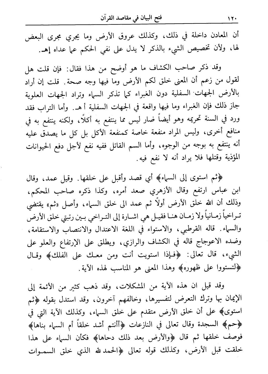 وقد قيل إن هذه الآية من المشكلات، وقد ذهب كثير من الأئمة إلى الإيمان بها وترك التعرض لتفسيرها، وخالفهم آخرون، وقد استدل بقوله (ثم استوى) على أن خلق الأرض متقدم على خلق السماء، وكذلك الآية التي في (حم) السجدة وقال تعالى في النازعات (أأنتم أشد خلقاً أم السماء بناها) فوصف خلقها ثم قال (والأرض بعد ذلك دحاها) فكأن السماء على هذا خلقت قبل الأرض، وكذلك قوله تعالى (والحمد لله الذي خلق السموات