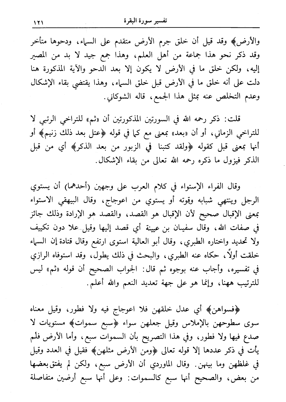 وقال الفراء الإستواء في كلام العرب على وجهين (أحدهما) أن يستوي الرجل وينتهي شبابه وقوته أو يستوي من اعوجاج، وقال البيهقي الاستواء بمعنى الإقبال صحيح لأن الإقبال هو القصد، والقصد هو الإرادة وذلك جائز في صفات الله، وقال سفيان بن عيينة أي قصد إليها وقيل علا دون تكييف ولا تحديد واختاره الطبري، وقال أبو العالية استوى ارتفع وقال قتادة إن السماء خلقت أولاً، حكاه عنه الطبري، والبحث في ذلك يطول، وقد استوفاه الرازي في تفسيره، وأجاب عنه بوجوه ثم قال: الجواب الصحيح أن قوله " ثم " ليس للترتيب ههنا، وإنما هو على جهة تعديد النعم والله أعلم.