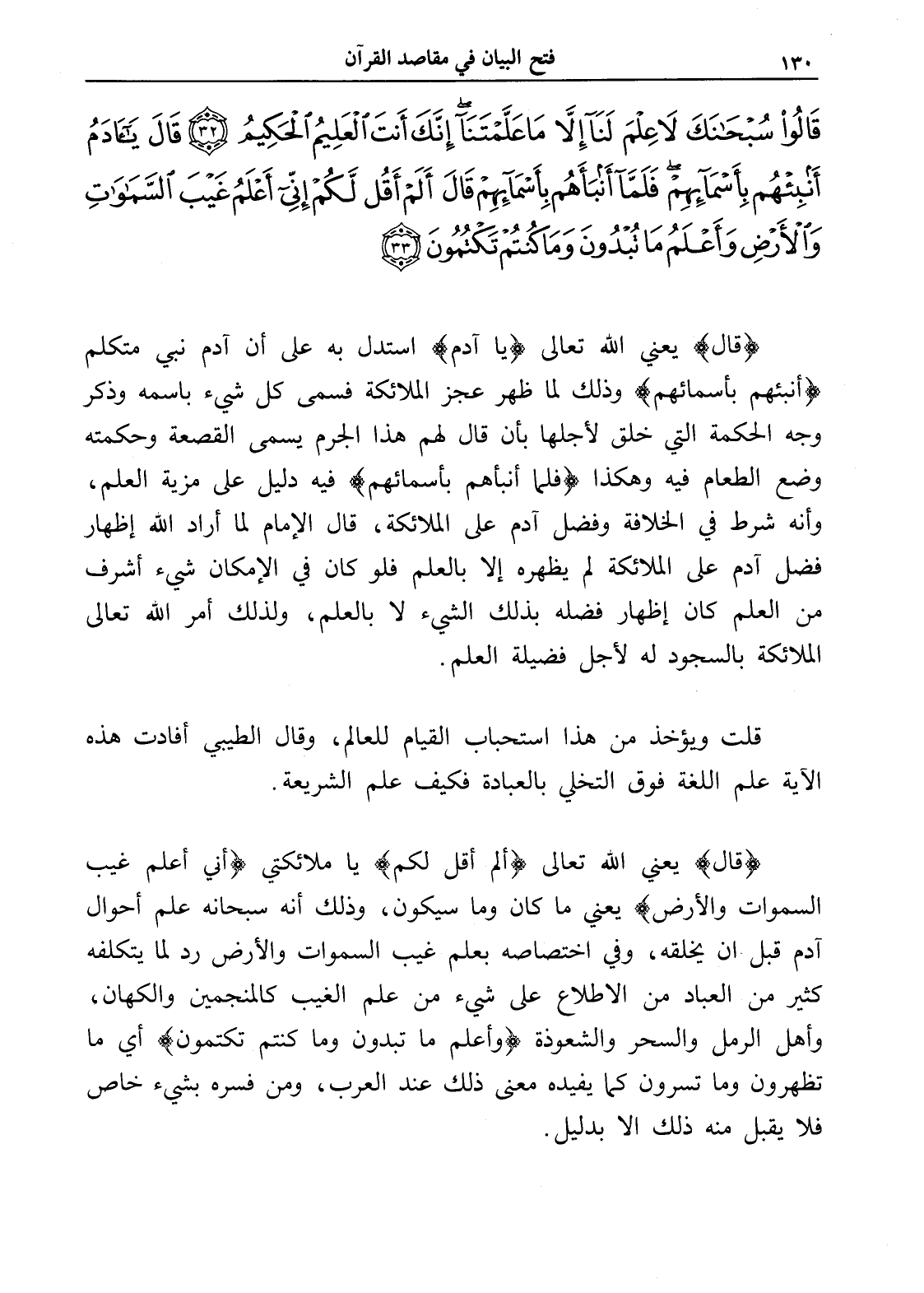 قَالُوا سُبْحَانَكَ لَا عِلْمَ لَنَا إِلَّا مَا عَلَّمْتَنَا إِنَّكَ أَنْتَ الْعَلِيمُ الْحَكِيمُ (32) قَالَ يَا آدَمُ أَنْبِئْهُمْ بِأَسْمَائِهِمْ فَلَمَّا أَنْبَأَهُمْ بِأَسْمَائِهِمْ قَالَ أَلَمْ أَقُلْ لَكُمْ إِنِّي أَعْلَمُ غَيْبَ السَّمَاوَاتِ وَالْأَرْضِ وَأَعْلَمُ مَا تُبْدُونَ وَمَا كُنْتُمْ تَكْتُمُونَ (33)