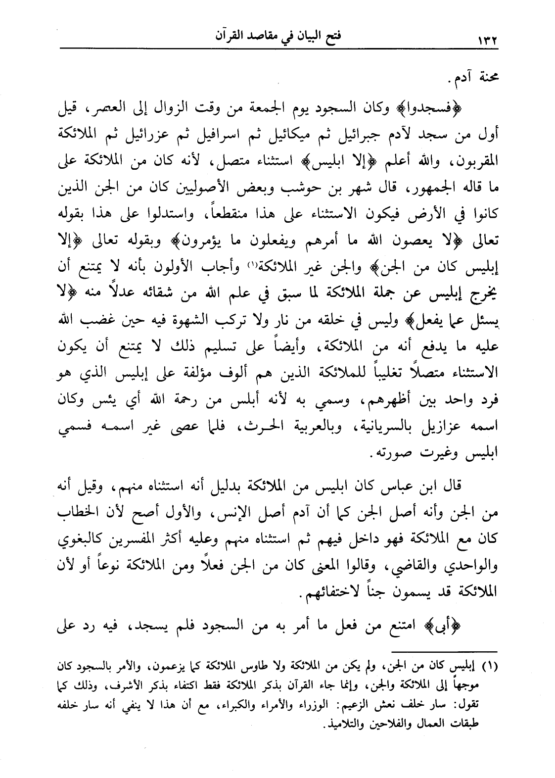 (¬1) إبليس كان من الجن، ولم يكن من الملائكة ولا طاوس الملائكة كما يزعمون، والأمر بالسجود كان موجهاً إلى الملائكة والجن، وإنما جاء القرآن بذكر الملائكة فقط اكتفاء بذكر الأشرف، وذلك كما تقول: سار خلف نعش الزعيم: الوزراء والأمراء والكبراء، مع أن هذا لا ينفي أنه سار خلفه طبقات العمال والفلاحين والتلاميذ.