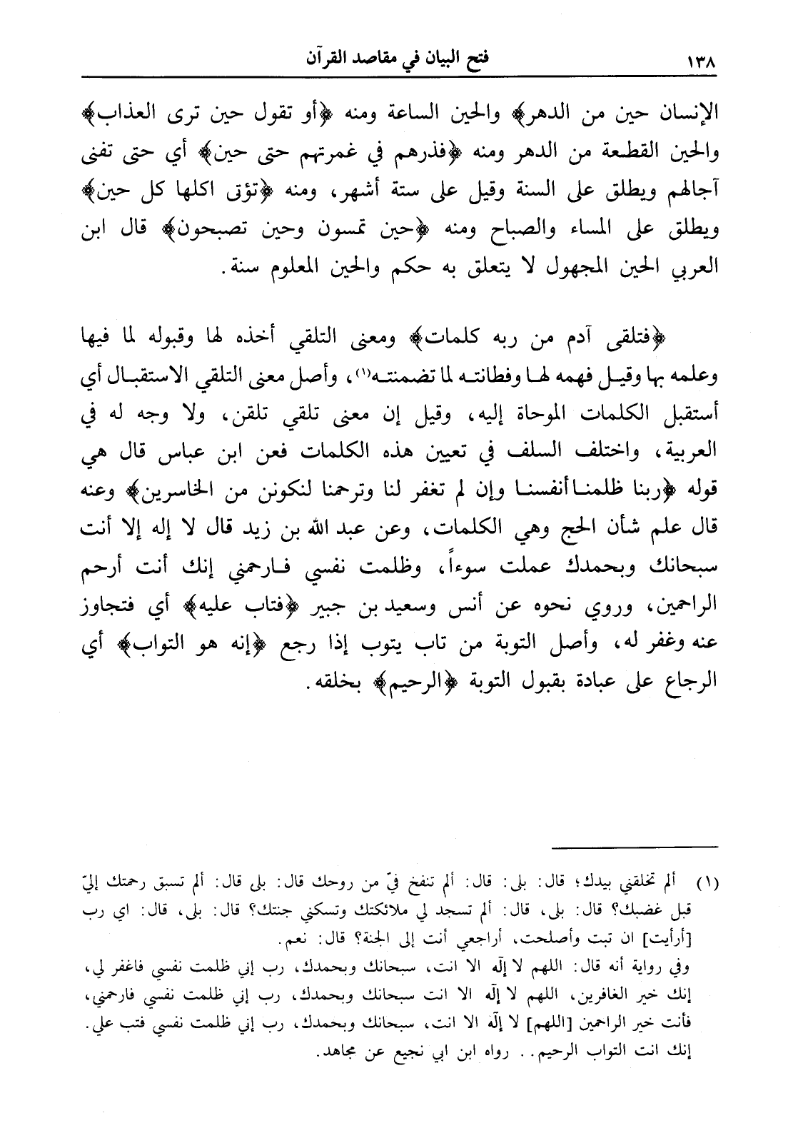 (فتلقى آدم من ربه كلمات) ومعنى التلقي أخذه لها وقبوله لا فيها وعلمه بها وقيل فهمه لها وفطانته لما تضمنته (¬1)، وأصل معنى التلقي الاستقبال أي أستقبل الكلمات الموحاة إليه، وقيل إن معنى تلقي تلقن، ولا وجه له في العربية، واختلف السلف في تعيين هذه الكلمات فعن ابن عباس قال هي قوله (ربنا ظلمنا أنفسنا وإن لم تغفر لنا وترحمنا لنكونن من الخاسرين) وعنه قال علم شأن الحج وهي الكلمات، وعن عبد الله بن زيد قال لا إله إلا أنت سبحانك وبحمدك عملت سوءاً، وظلمت نفسي فارحمني إنك أنت أرحم الراحمين، وروي نحوه عن أنس وسعيد بن جبير (فتاب عليه) أي فتجاوز عنه وغفر له، وأصل التوبة من تاب يتوب إذا رجع (إنه هو التواب) أي الرجاع على عبادة بقبول التوبة (الرحيم) بخلقه.