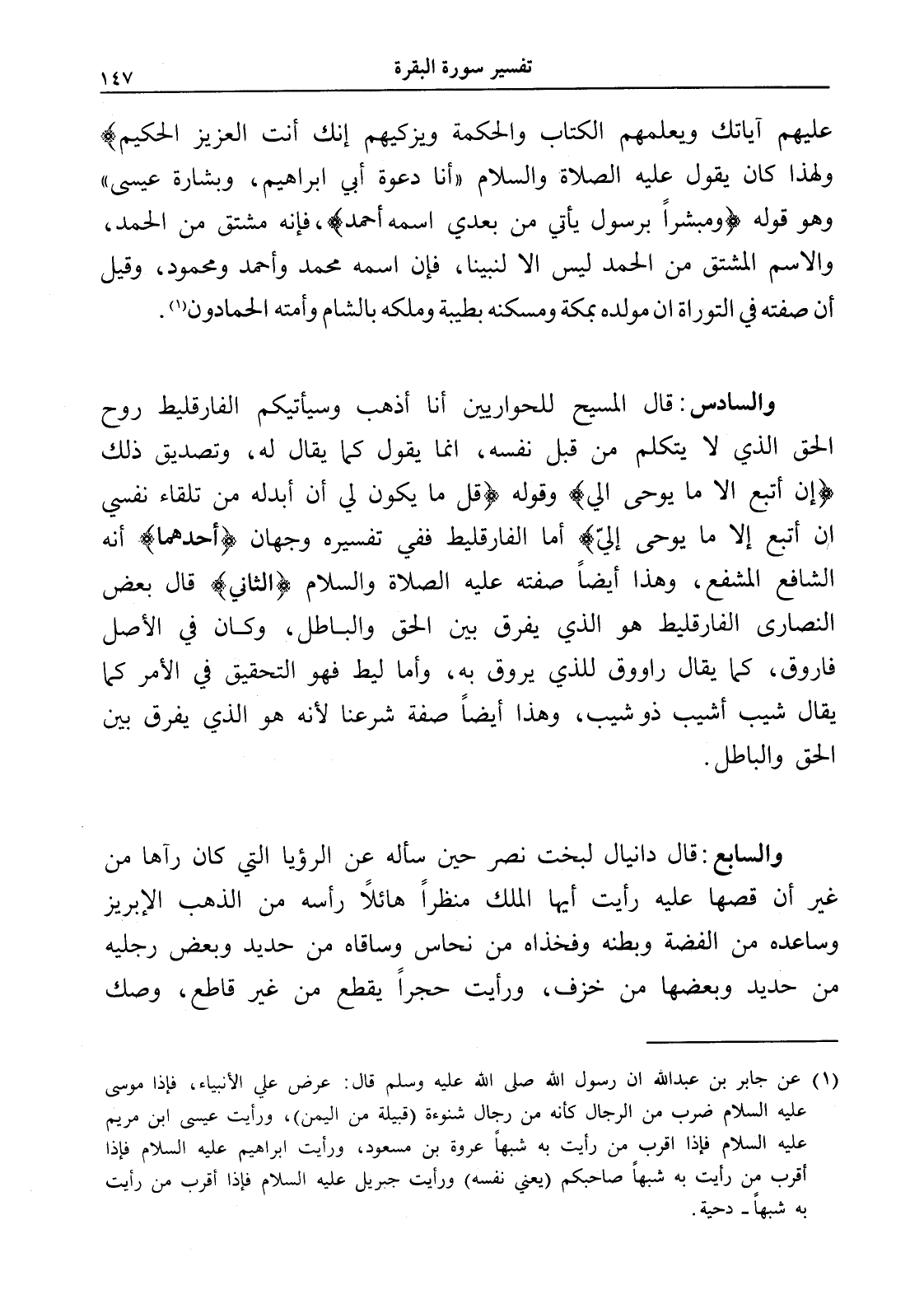 والسادس: قال المسيح للحواريين أنا أذهب وسيأتيكم الفارقليط روح الحق الذي لا يتكلم من قبل نفسه، إنما يقول كما يقال له، وتصديق ذلك (إن أتبع إلا ما يوحى الي) وقوله (قل ما يكون لي أن أبدله من تلقاء نفسي إن أتبع إلا ما يوحى إليّ) أما الفارقليط ففي تفسيره وجهان (أحدهما) أنه الشافع المشفع، وهذا أيضاً صفته عليه الصلاة والسلام (الثاني) قال بعض النصارى الفارقليط هو الذي يفرق بين الحق والباطل، وكان في الأصل فاروق، كما يقال راووق للذي يروق به، وأما ليط فهو التحقيق في الأمر كما يقال شيب أشيب ذو شيب، وهذا أيضاً صفة شرعنا لأنه هو الذي يفرق بين الحق والباطل.