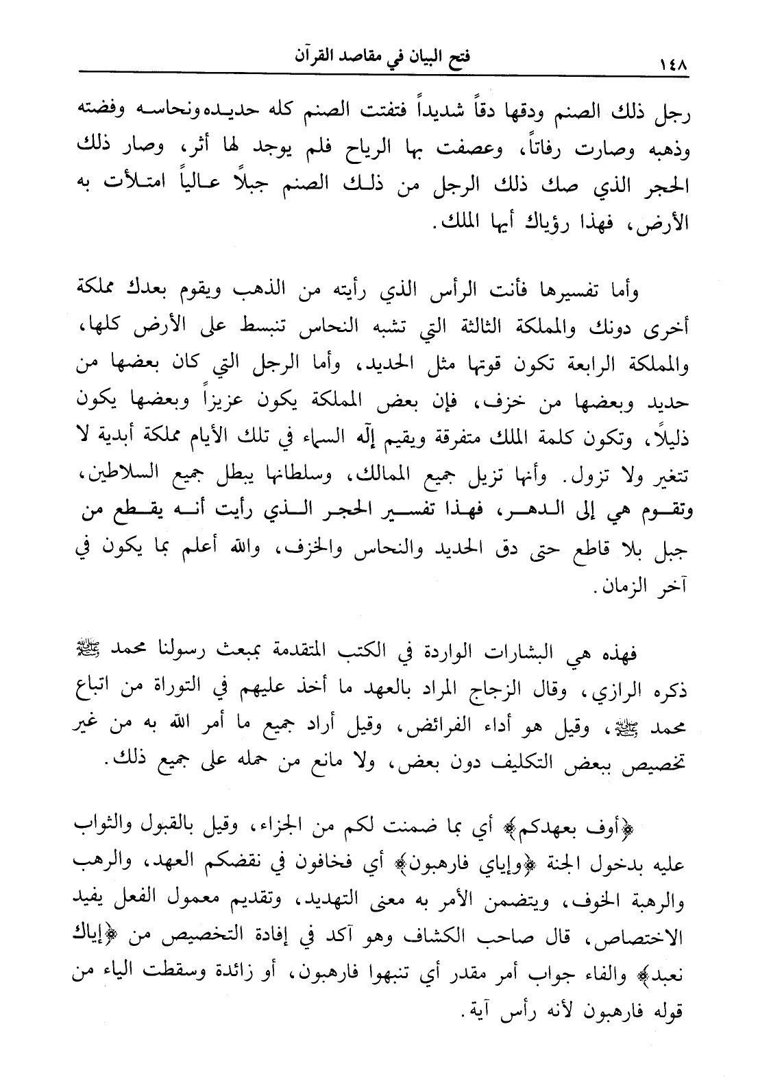 وأما تفسيرها فأنت الرأس الذي رأيته من الذهب ويقوم بعدك مملكة أخرى دونك والمملكة الثالثة التي تشبه النحاس تنبسط على الأرض كلها، والمملكة الرابعة تكون قوتها مثل الحديد، وأما الرجل التي كان بعضها من حديد وبعضها من خزف، فإن بعض المملكة يكون عزيزاً وبعضها يكون ذليلاً، وتكون كلمة الملك متفرقة ويقيم إله السماء في تلك الأيام مملكة أبدية لا تتغير ولا تزول. وأنها تزيل جميع الممالك، وسلطانها يبطل جميع السلاطين، وتقوم هي إلى الدهر، فهذا تفسير الحجر الذي رأيت أنه يقطع من جبل بلا قاطع حتى دق الحديد والنحاس والخزف، والله أعلم بما يكون في آخر الزمان.