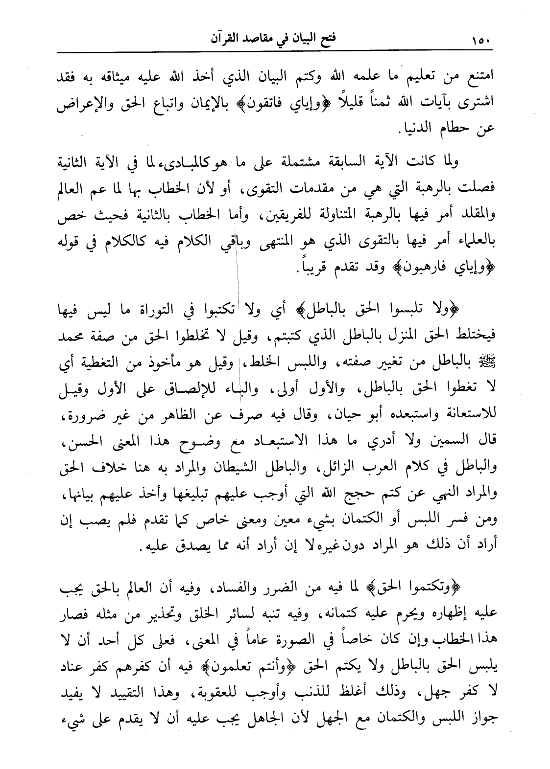 (وتكتموا الحق) لما فيه من الضرر والفساد، وفيه أن العالم بالحق يجب عليه إظهاره ويحرم عليه كتمانه، وفيه تنبه لسائر الخلق وتحذير من مثله فصار هذا الخطاب وإن كان خاصاً في الصورة عاماً في المعنى، فعلى كل أحد أن لا يلبس الحق بالباطل ولا يكتم الحق (وأنتم تعلمون) فيه أن كفرهم كفر عناد لا كفر جهل، وذلك أغلظ للذنب وأوجب للعقوبة، وهذا التقييد لا يفيد جواز اللبس والكتمان مع الجهل لأن الجاهل يجب عليه أن لا يقدم على شيء