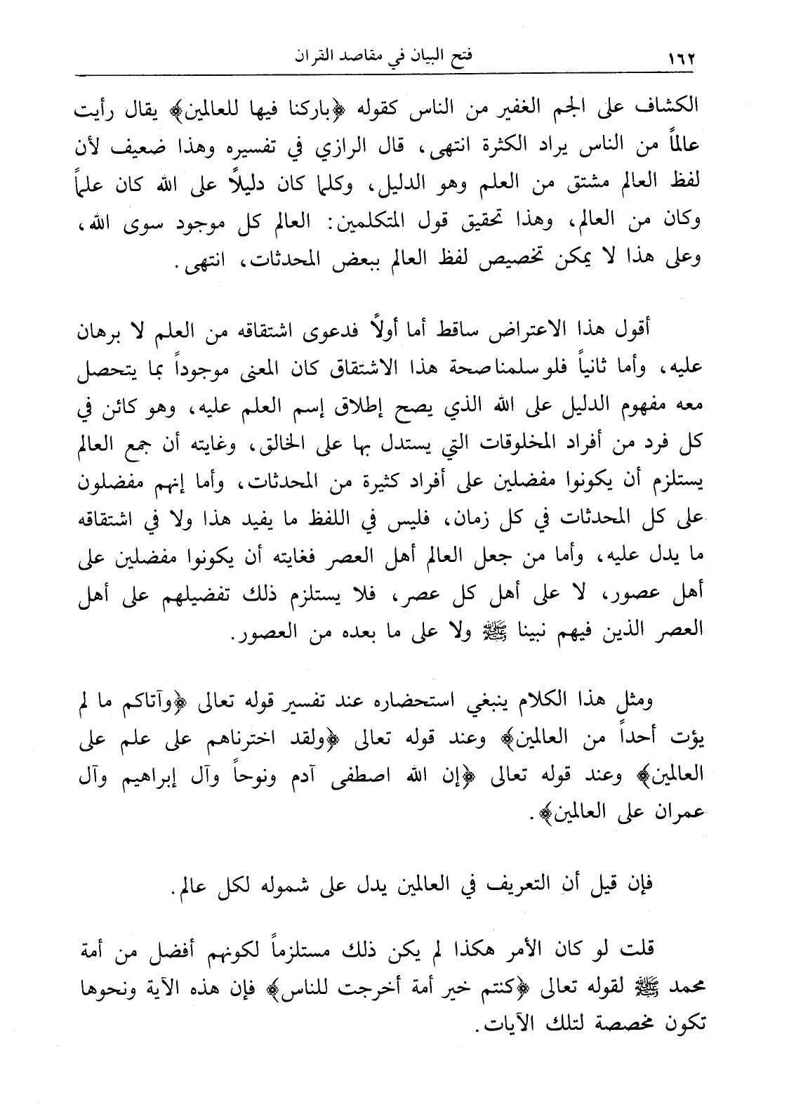 أقول هذا الاعتراض ساقط أما أولاً فدعوى اشتقاقه من العلم لا برهان عليه، وأما ثانياً فلو سلمنا صحة هذا الاشتقاق كان المعنى موجوداً بما يتحصل معه مفهوم الدليل على الله الذي يصح إطلاق اسم العلم عليه، وهو كائن في كل فرد من أفراد المخلوقات التي يستدل بها على الخالق، وغايته أن جمع العالم يستلزم أن يكونوا مفضلين على أفراد كثيرة من المحدثات، وأما إنهم مفضلون على كل المحدثات في كل زمان، فليس في اللفظ ما يفيد هذا ولا في اشتقاقه ما يدل عليه، وأما من جعل العالم أهل العصر فغايته أن يكونوا مفضلين على أهل عصور، لا على أهل كل عصر، فلا يستلزم ذلك تفضيلهم على أهل العصر الذين فيهم نبينا - صلى الله عليه وسلم - ولا على ما بعده من العصور.