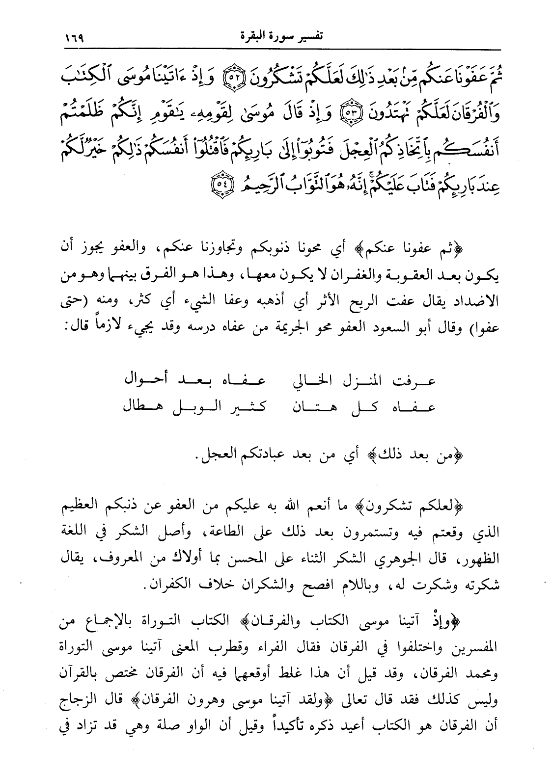 ثُمَّ عَفَوْنَا عَنْكُمْ مِنْ بَعْدِ ذَلِكَ لَعَلَّكُمْ تَشْكُرُونَ (52) وَإِذْ آَتَيْنَا مُوسَى الْكِتَابَ وَالْفُرْقَانَ لَعَلَّكُمْ تَهْتَدُونَ (53) وَإِذْ قَالَ مُوسَى لِقَوْمِهِ يَا قَوْمِ إِنَّكُمْ ظَلَمْتُمْ أَنْفُسَكُمْ بِاتِّخَاذِكُمُ الْعِجْلَ فَتُوبُوا إِلَى بَارِئِكُمْ فَاقْتُلُوا أَنْفُسَكُمْ ذَلِكُمْ خَيْرٌ لَكُمْ عِنْدَ بَارِئِكُمْ فَتَابَ عَلَيْكُمْ إِنَّهُ هُوَ التَّوَّابُ الرَّحِيمُ (54)