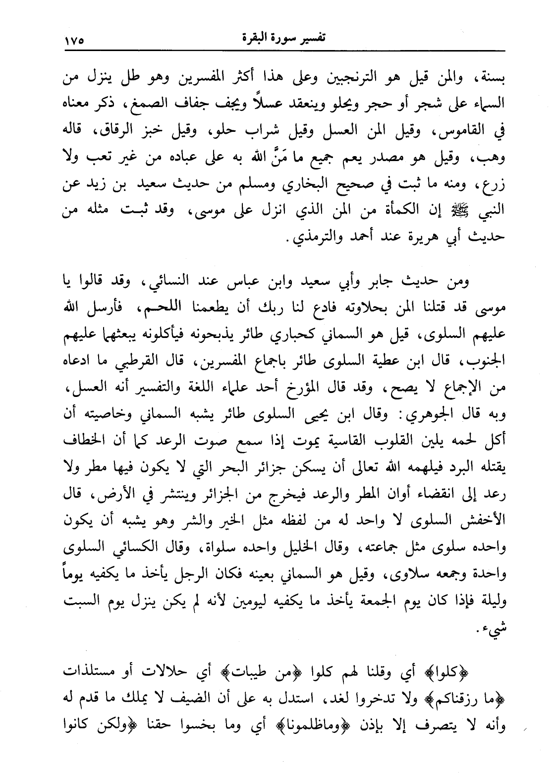 ومن حديث جابر وأبى سعيد وابن عباس عند النسائي، وقد قالوا يا موسى قد قتلنا المن بحلاوته فادع لنا ربك أن يطعمنا اللحم، فأرسل الله عليهم السلوى، قيل هو السماني كحباري طائر يذبحونه فيأكلونه يبعثهما عليهم الجنوب، قال ابن عطية السلوى طائر بإجماع المفسرين، قال القرطبي ما ادعاه من الإجماع لا يصح، وقد قال المؤرخ أحد علماء اللغة والتفسير أنه العسل، وبه قال الجوهري: وقال ابن يحيى السلوى طائر يشبه السماني وخاصيته أن أكل لحمه يلين القلوب القاسية يموت إذا سمع صوت الرعد كما أن الخطاف يقتله البرد فيلهمه الله تعالى أن يسكن جزائر البحر التي لا يكون فيها مطر ولا رعد إلى انقضاء أوان المطر والرعد فيخرج من الجزائر وينتشر في الأرض، قال الأخفش السلوى لا واحد له من لفظه مثل الخير والشر وهو يشبه أن يكون واحده سلوى مثل جماعته، وقال الخليل واحده سلواة، وقال الكسائي السلوى واحدة وجمعه سلاوى، وقيل هو السماني بعينه فكان الرجل يأخذ ما يكفيه يوماً وليلة فإذا كان يوم الجمعة يأخذ ما يكفيه ليومين لأنه لم يكن ينزل يوم السبت شيء.