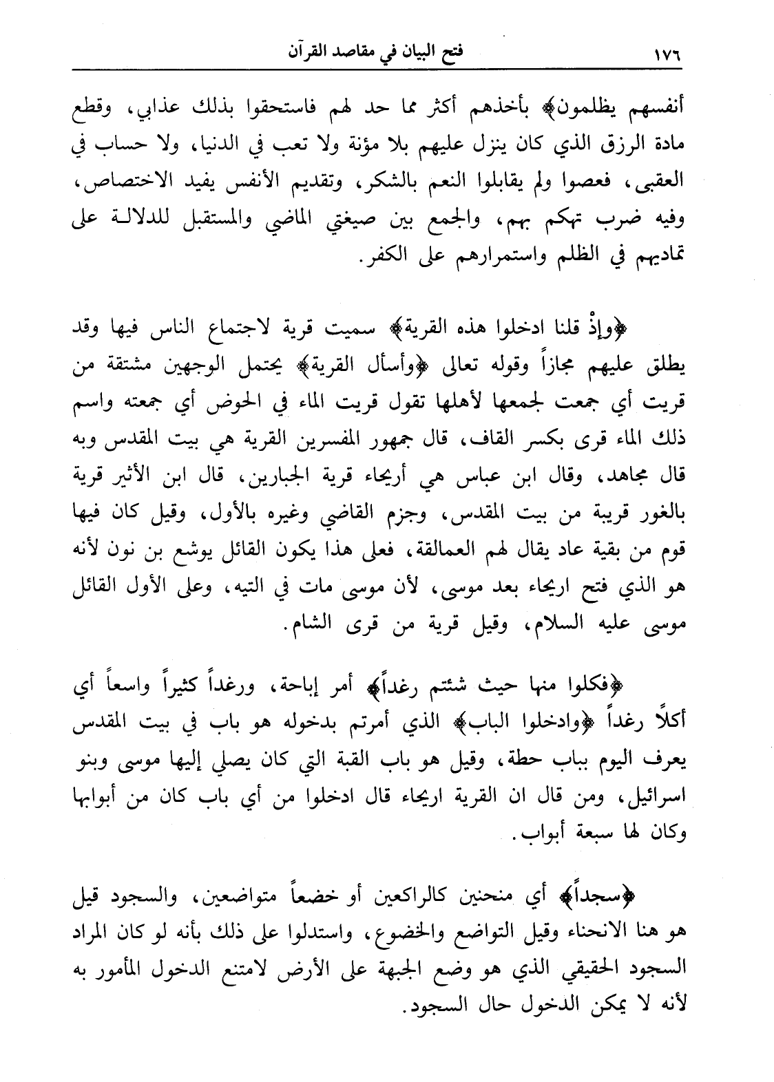 (وإذْ قلنا ادخلوا هذه القرية) سميت قرية لاجتماع الناس فيها وقد يطلق عليهم مجازاً وقوله تعالى (واسأل القرية) يحتمل الوجهين مشتقة من قريت أي جمعت لجمعها لأهلها تقول قريت الماء في الحوض أي جمعته واسم ذلك الماء قرى بكسر القاف، قال جمهور المفسرين القرية هي بيت المقدس وبه قال مجاهد، وقال ابن عباس هي أريحاء قرية الجبارين، قال ابن الأثير قرية بالغور قريبة من بيت المقدس، وجزم القاضي وغيره بالأول، وقيل كان فيها قوم من بقية عاد يقال لهم العمالقة، فعلى هذا يكون القائل يوشع بن نون لأنه هو الذي فتح اريحاء بعد موسى، لأن موسى مات في التيه، وعلى الأول القائل موسى عليه السلام، وقيل قرية من قرى الشام.