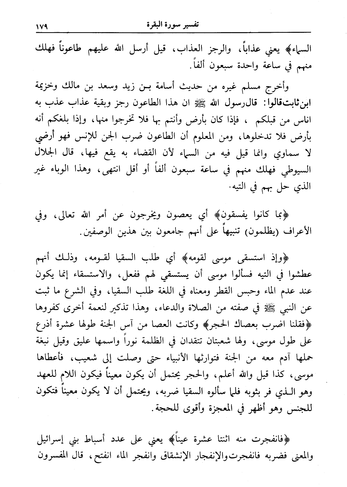 وأخرج مسلم غيره من حديث أسامة بن زيد وسعد بن مالك وخزيمة ابن ثابت قالوا: قال رسول الله - صلى الله عليه وسلم - إن هذا الطاعون رجز وبقية عذاب عذب به أناس من قبلكم، فإذا كان بأرض وأنتم بها فلا تخرجوا منها، وإذا بلغكم أنه بأرض فلا تدخلوها، ومن المعلوم أن الطاعون ضرب الجن للإنس فهو أرضي لا سماوي وإنما قيل فيه من السماء لأن القضاء به يقع فيها، قال الجلال السيوطي فهلك منهم في ساعة سبعون ألفاً أو أقل انتهى، وهذا الوباء غير الذي حل بهم في التيه.