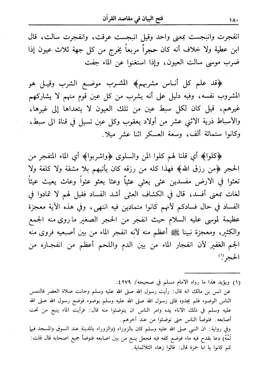 انفجرت وانبجست بمعنى واحد وقيل انبجست عرقت، وانفجرت سالت، قال ابن عطية ولا خلاف أنه كان حجراً مربعاً يخرج من كل جهة ثلاث عيون إذا ضرب موسى سالت العيون، وإذا استغنوا عن الماء جفت.