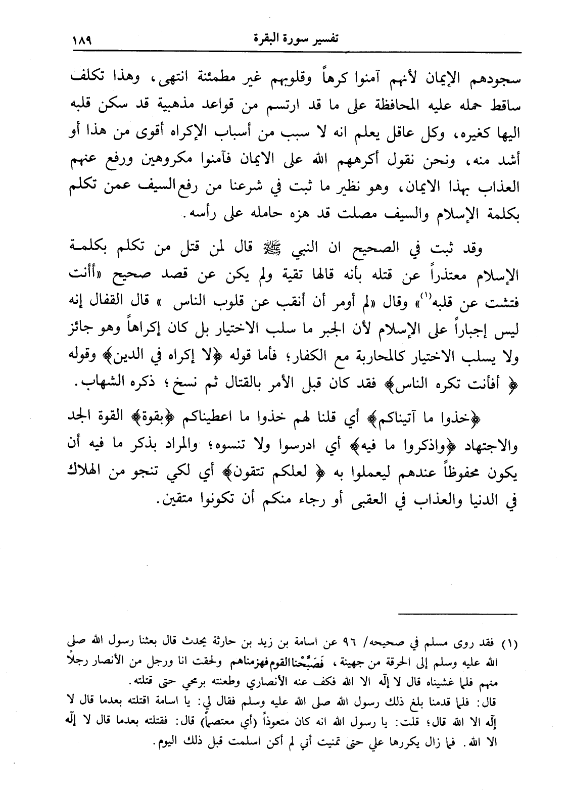 (¬1) فقد روى مسلم في صحيحه/96 عن أسامة بن زيد بن حارثة يحدث قال بعثنا رسول الله صلى الله عليه وسلم إلى الحرقة من جهينة، فَصَبَّحْنا القوم فهزمناهم ولحقت أنا ورجل من الأنصار رجلاً منهم فلما غشيناه قال لا إله إلا الله فكف عنه الأنصاري وطعنته برمحي حتى قتلته.