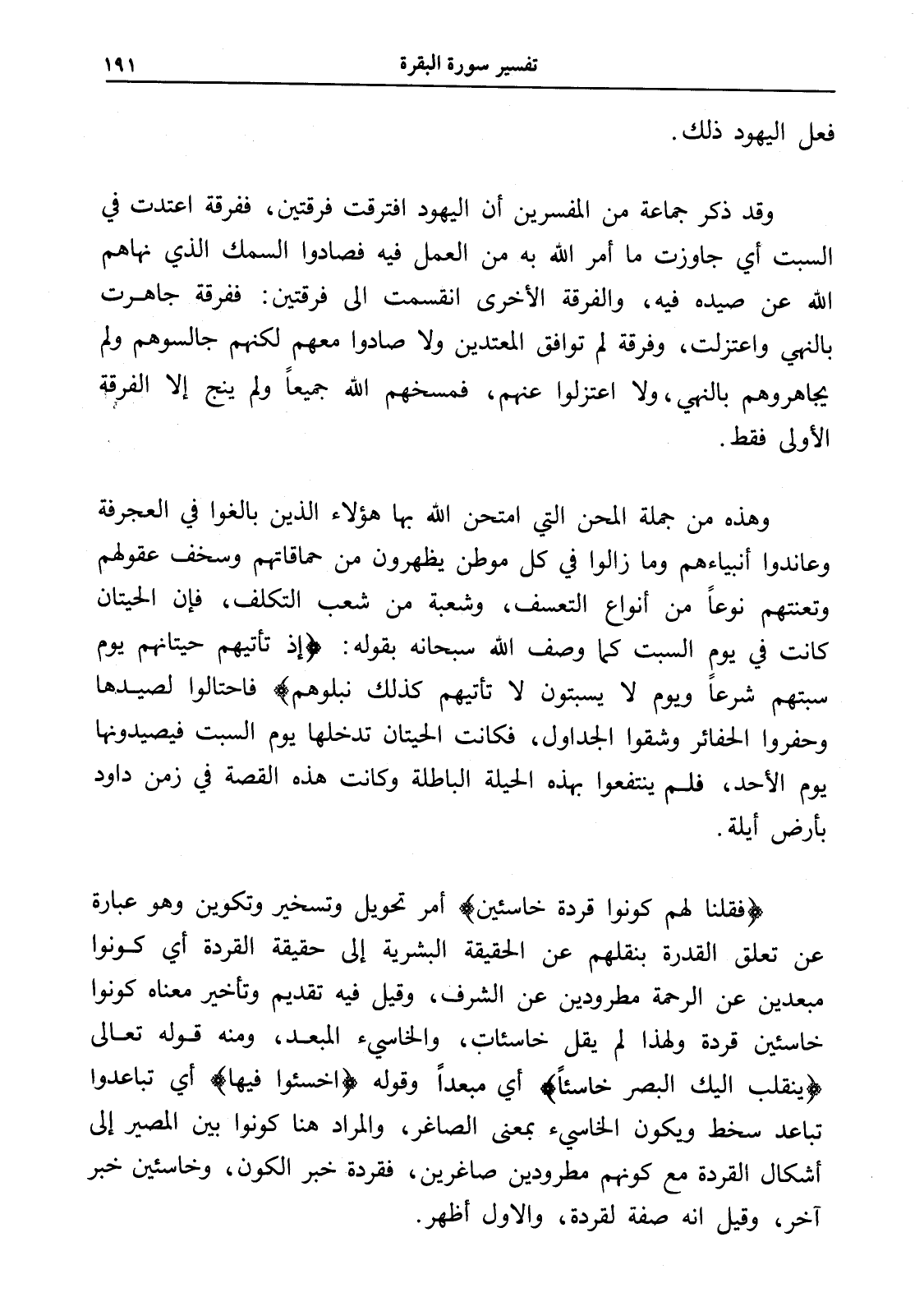 وقد ذكر جماعة من المفسرين أن اليهود افترقت فرقتين، ففرقة اعتدت في السبت أي جاوزت ما أمر الله به من العمل فيه فصادوا السمك الذي نهاهم الله عن صيده فيه، والفرقة الأخرى انقسمت إلى فرقتين: ففرقة جاهرت بالنهي واعتزلت، وفرقة لم توافق المعتدين ولا صادوا معهم لكنهم جالسوهم ولم يجاهروهم بالنهي، ولا اعتزلوا عنهم، فمسخهم الله جميعاً ولم ينج إلا الفرقة الأولى فقط.