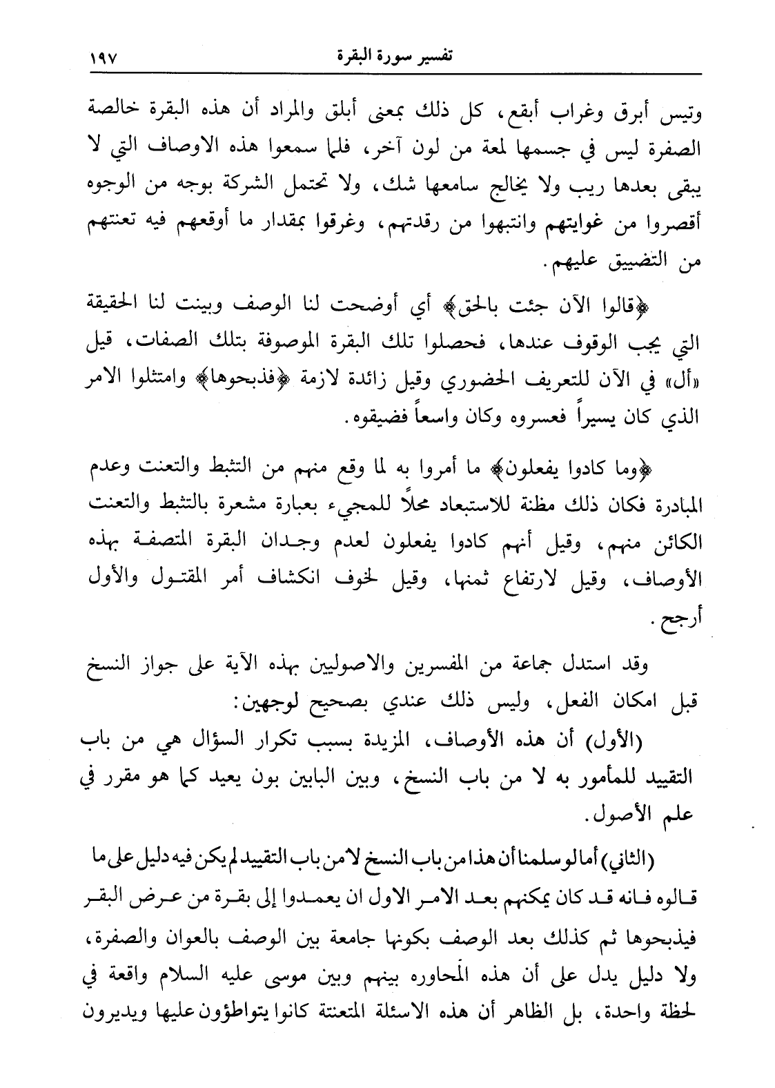 (الثاني) أما لو سلمنا أن هذا من باب النسخ لا من باب التقييد لم يكن فيه دليل على ما قالوه فإنه قد كان يمكنهم بعد الأمر الأول أن يعمدوا إلا بقرة من عرض البقر فيذبحوها ثم كذلك بعد الوصف بكونها جامعة بين الوصف بالعوان والصفرة، ولا دليل يدل على أن هذه المحاوره بينهم وبين موسى عليه السلام واقعة في لحظة واحدة، بل الظاهر أن هذه الأسئلة المتعنتة كانوا يتواطؤون عليها ويديرون