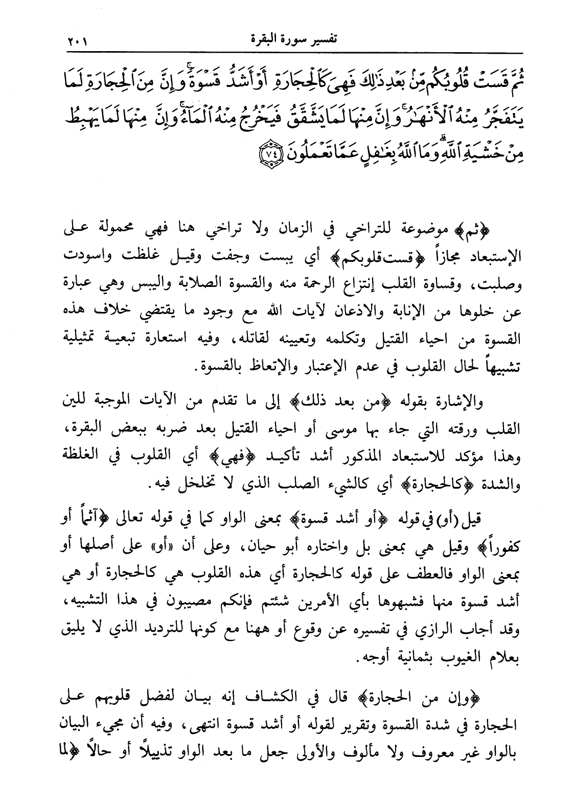 ثُمَّ قَسَتْ قُلُوبُكُمْ مِنْ بَعْدِ ذَلِكَ فَهِيَ كَالْحِجَارَةِ أَوْ أَشَدُّ قَسْوَةً وَإِنَّ مِنَ الْحِجَارَةِ لَمَا يَتَفَجَّرُ مِنْهُ الْأَنْهَارُ وَإِنَّ مِنْهَا لَمَا يَشَّقَّقُ فَيَخْرُجُ مِنْهُ الْمَاءُ وَإِنَّ مِنْهَا لَمَا يَهْبِطُ مِنْ خَشْيَةِ اللَّهِ وَمَا اللَّهُ بِغَافِلٍ عَمَّا تَعْمَلُونَ (74)