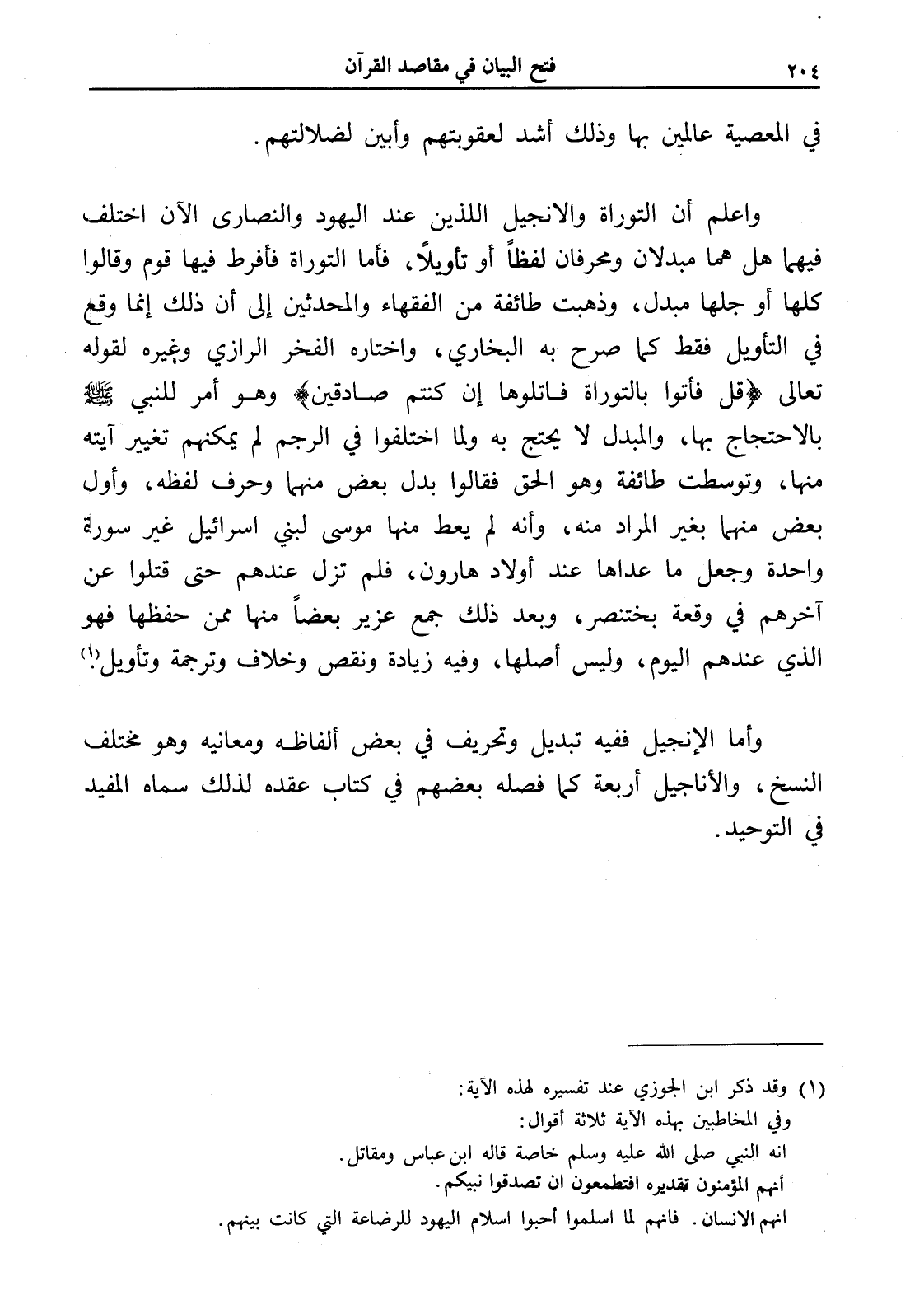 واعلم أن التوراة والإنجيل اللذين عند اليهود والنصارى الآن اختلف فيهما هل هما مبدلان ومحرفان لفظاً أو تأويلاً، فأما التوراة فأفرط فيها قوم وقالوا كلها أو جلها مبدل، وذهبت طائفة من الفقهاء والمحدثين إلى أن ذلك إنما وقع في التأويل فقط كما صرح به البخاري، واختاره الفخر الرازي وغيره لقوله تعالى (قل فأتوا بالتوراة فاتلوها إن كنتم صادقين) وهو أمر للنبي - صلى الله عليه وسلم - بالاحتجاج بها، والمبدل لا يحتج به ولما اختلفوا في الرجم لم يمكنهم تغيير آيته منها، وتوسطت طائفة وهو الحق فقالوا بدل بعض منهما وحرف لفظه، وأول بعض منهما بغير المراد منه، وأنه لم يعط منها موسى لبني اسرائيل غير سورة واحدة وجعل ما عداها عند أولاد هارون، فلم تزل عندهم حتى قتلوا عن آخرهم في وقعة بختنصر، وبعد ذلك جمع عزير بعضاً منها ممن حفظها فهو الذي عندهم اليوم، وليس أصلها، وفيه زيادة ونقص وخلاف وترجمة وتأويل. (¬1)