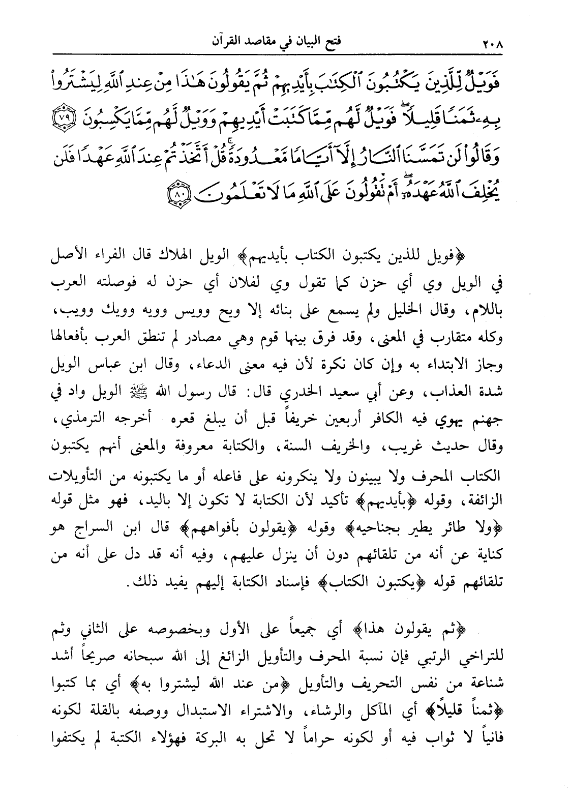 فَوَيْلٌ لِلَّذِينَ يَكْتُبُونَ الْكِتَابَ بِأَيْدِيهِمْ ثُمَّ يَقُولُونَ هَذَا مِنْ عِنْدِ اللَّهِ لِيَشْتَرُوا بِهِ ثَمَنًا قَلِيلاً فَوَيْلٌ لَهُمْ مِمَّا كَتَبَتْ أَيْدِيهِمْ وَوَيْلٌ لَهُمْ مِمَّا يَكْسِبُونَ (79) وَقَالُوا لَنْ تَمَسَّنَا النَّارُ إِلَّا أَيَّامًا مَعْدُودَةً قُلْ أَتَّخَذْتُمْ عِنْدَ اللَّهِ عَهْدًا فَلَنْ يُخْلِفَ اللَّهُ عَهْدَهُ أَمْ تَقُولُونَ عَلَى اللَّهِ مَا لَا تَعْلَمُونَ (80)