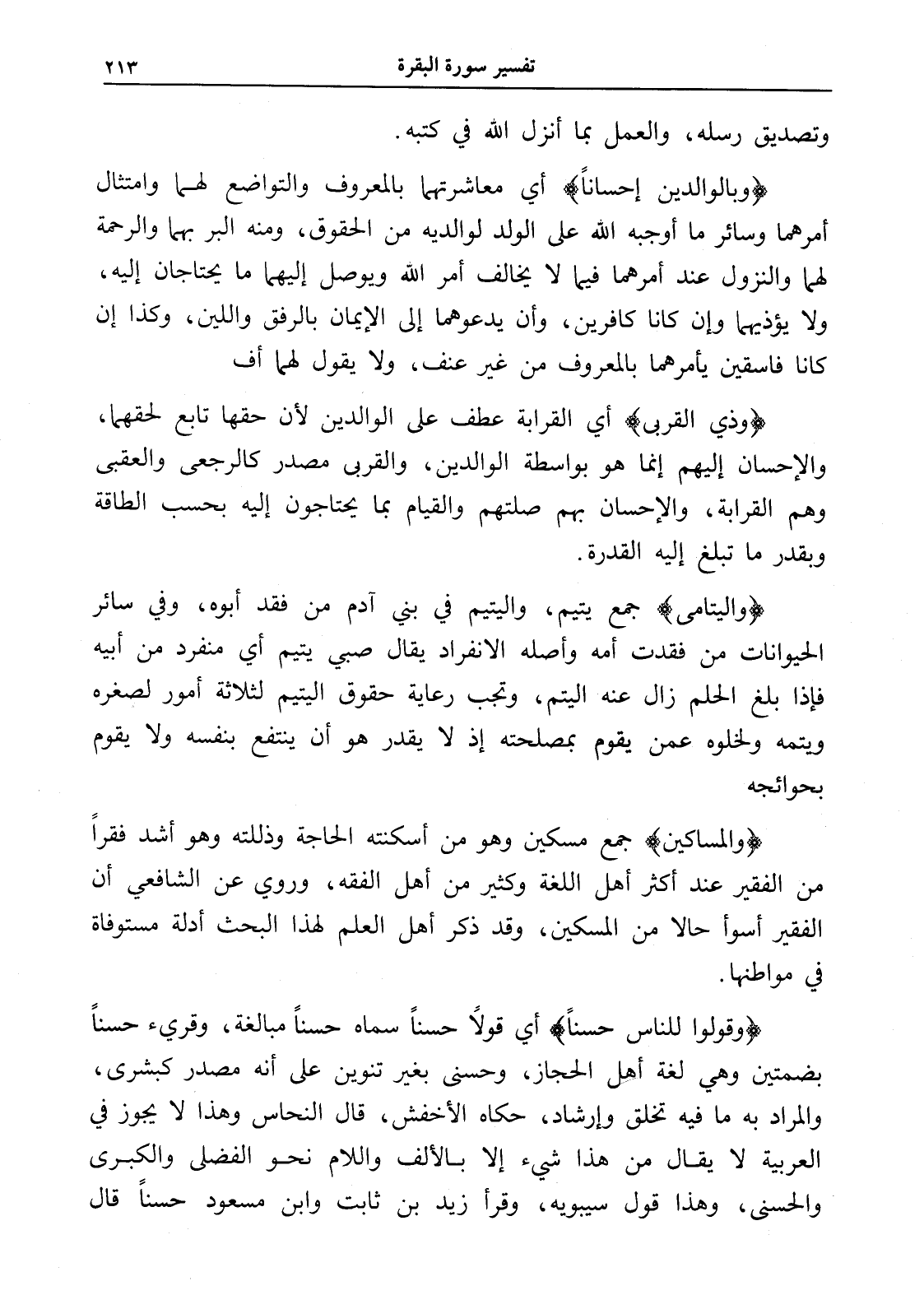(وبالوالدين إحساناً) أي معاشرتهما بالمعروف والتواضع لهما وامتثال أمرهما وسائر ما أوجبه الله على الولد لوالديه من الحقوق، ومنه البر بهما والرحمة لهما والنزول عند أمرهما فيما لا يخالف أمر الله ويوصل إليهما ما يحتاجان إليه، ولا يؤذيهما وإن كانا كافرين، وأن يدعوهما إلى الإيمان بالرفق واللين، وكذا إن كانا فاسقين يأمرهما بالمعروف من غير عنف، ولا يقول لهما أف.