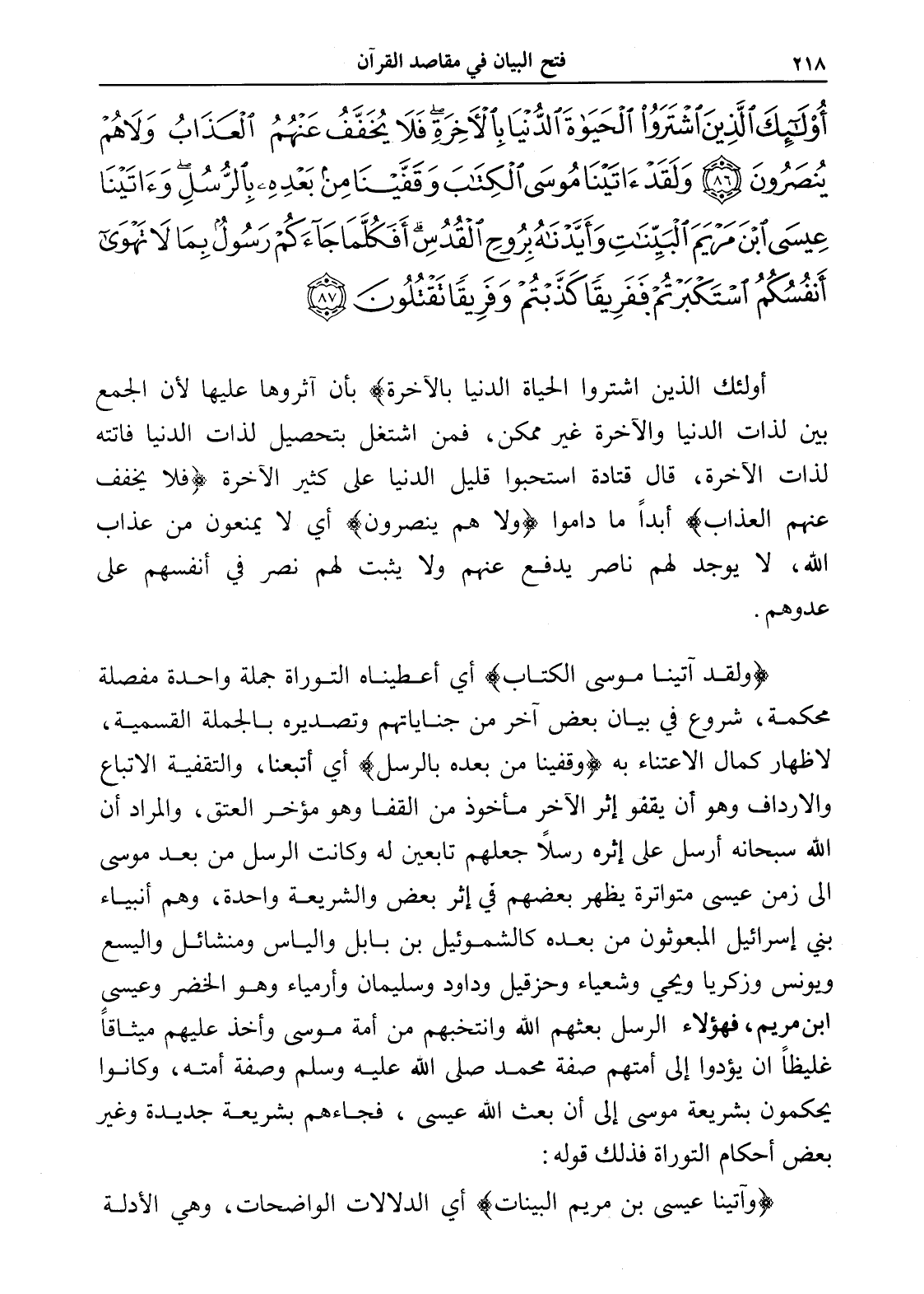 أُولَئِكَ الَّذِينَ اشْتَرَوُا الْحَيَاةَ الدُّنْيَا بِالْآَخِرَةِ فَلَا يُخَفَّفُ عَنْهُمُ الْعَذَابُ وَلَا هُمْ يُنْصَرُونَ (86) وَلَقَدْ آَتَيْنَا مُوسَى الْكِتَابَ وَقَفَّيْنَا مِنْ بَعْدِهِ بِالرُّسُلِ وَآَتَيْنَا عِيسَى ابْنَ مَرْيَمَ الْبَيِّنَاتِ وَأَيَّدْنَاهُ بِرُوحِ الْقُدُسِ أَفَكُلَّمَا جَاءَكُمْ رَسُولٌ بِمَا لَا تَهْوَى أَنْفُسُكُمُ اسْتَكْبَرْتُمْ فَفَرِيقًا كَذَّبْتُمْ وَفَرِيقًا تَقْتُلُونَ (87)