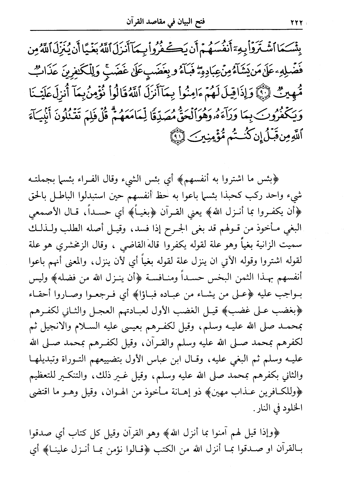 بِئْسَمَا اشْتَرَوْا بِهِ أَنْفُسَهُمْ أَنْ يَكْفُرُوا بِمَا أَنْزَلَ اللَّهُ بَغْيًا أَنْ يُنَزِّلَ اللَّهُ مِنْ فَضْلِهِ عَلَى مَنْ يَشَاءُ مِنْ عِبَادِهِ فَبَاءُوا بِغَضَبٍ عَلَى غَضَبٍ وَلِلْكَافِرِينَ عَذَابٌ مُهِينٌ (90) وَإِذَا قِيلَ لَهُمْ آَمِنُوا بِمَا أَنْزَلَ اللَّهُ قَالُوا نُؤْمِنُ بِمَا أُنْزِلَ عَلَيْنَا وَيَكْفُرُونَ بِمَا وَرَاءَهُ وَهُوَ الْحَقُّ مُصَدِّقًا لِمَا مَعَهُمْ قُلْ فَلِمَ تَقْتُلُونَ أَنْبِيَاءَ اللَّهِ مِنْ قَبْلُ إِنْ كُنْتُمْ مُؤْمِنِينَ (91)