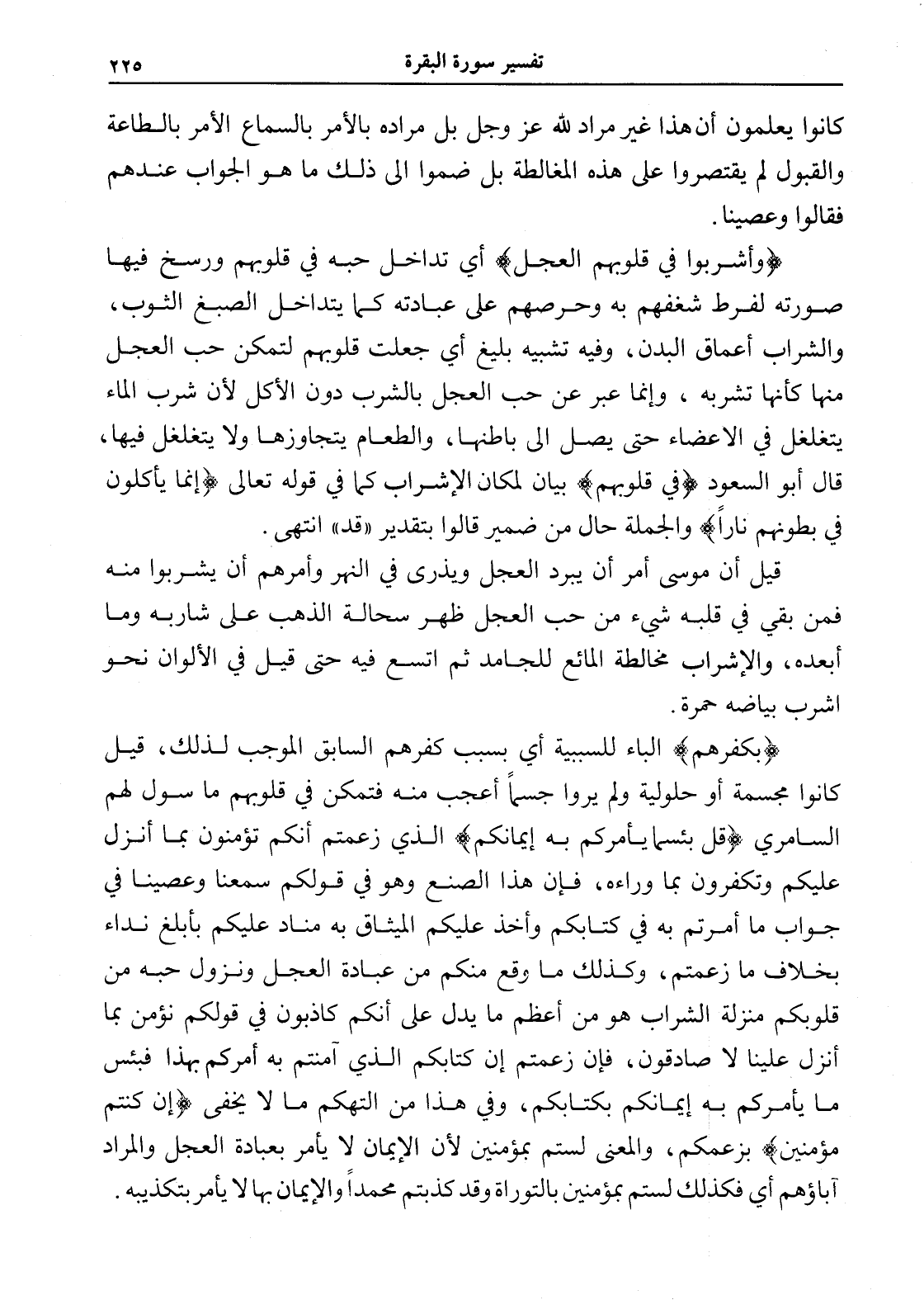 (وأشربوا في قلوبهم العجل) أي تداخل حبه في قلوبهم ورسخ فيها صورته لفرط شغفهم به وحرصهم على عبادته كما يتداخل الصبغ الثوب، والشراب أعماق البدن، وفيه تشبيه بليغ أي جعلت قلوبهم لتمكن حب العجل منها كأنها تشربه، وإنما عبر عن حب العجل بالشرب دون الأكل لأن شرب الماء يتغلغل في الأعضاء حتى يصل إلى باطنها، والطعام يتجاوزها ولا يتغلغل فيها، قال أبو السعود (في قلوبهم) بيان لمكان الإشراب كما في قوله تعالى (إنما يأكلون في بطونهم ناراً) والجملة حال من ضمير قالوا بتقدير " قد " انتهى.