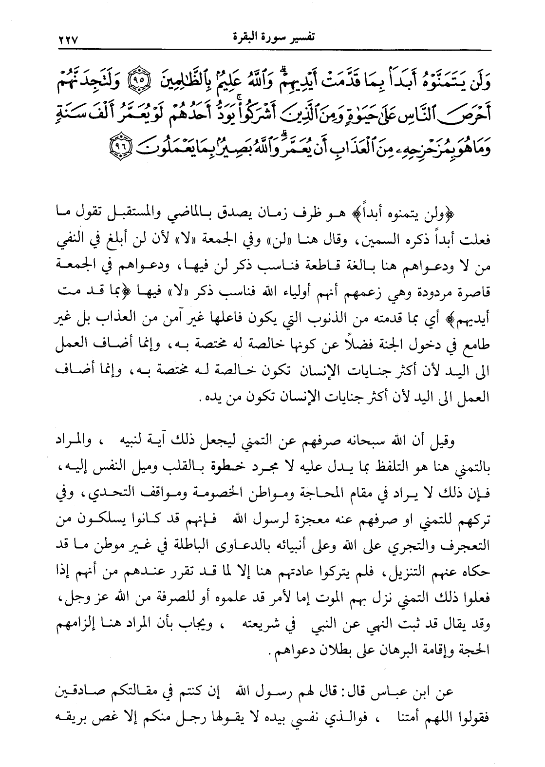وَلَنْ يَتَمَنَّوْهُ أَبَدًا بِمَا قَدَّمَتْ أَيْدِيهِمْ وَاللَّهُ عَلِيمٌ بِالظَّالِمِينَ (95) وَلَتَجِدَنَّهُمْ أَحْرَصَ النَّاسِ عَلَى حَيَاةٍ وَمِنَ الَّذِينَ أَشْرَكُوا يَوَدُّ أَحَدُهُمْ لَوْ يُعَمَّرُ أَلْفَ سَنَةٍ وَمَا هُوَ بِمُزَحْزِحِهِ مِنَ الْعَذَابِ أَنْ يُعَمَّرَ وَاللَّهُ بَصِيرٌ بِمَا يَعْمَلُونَ (96)