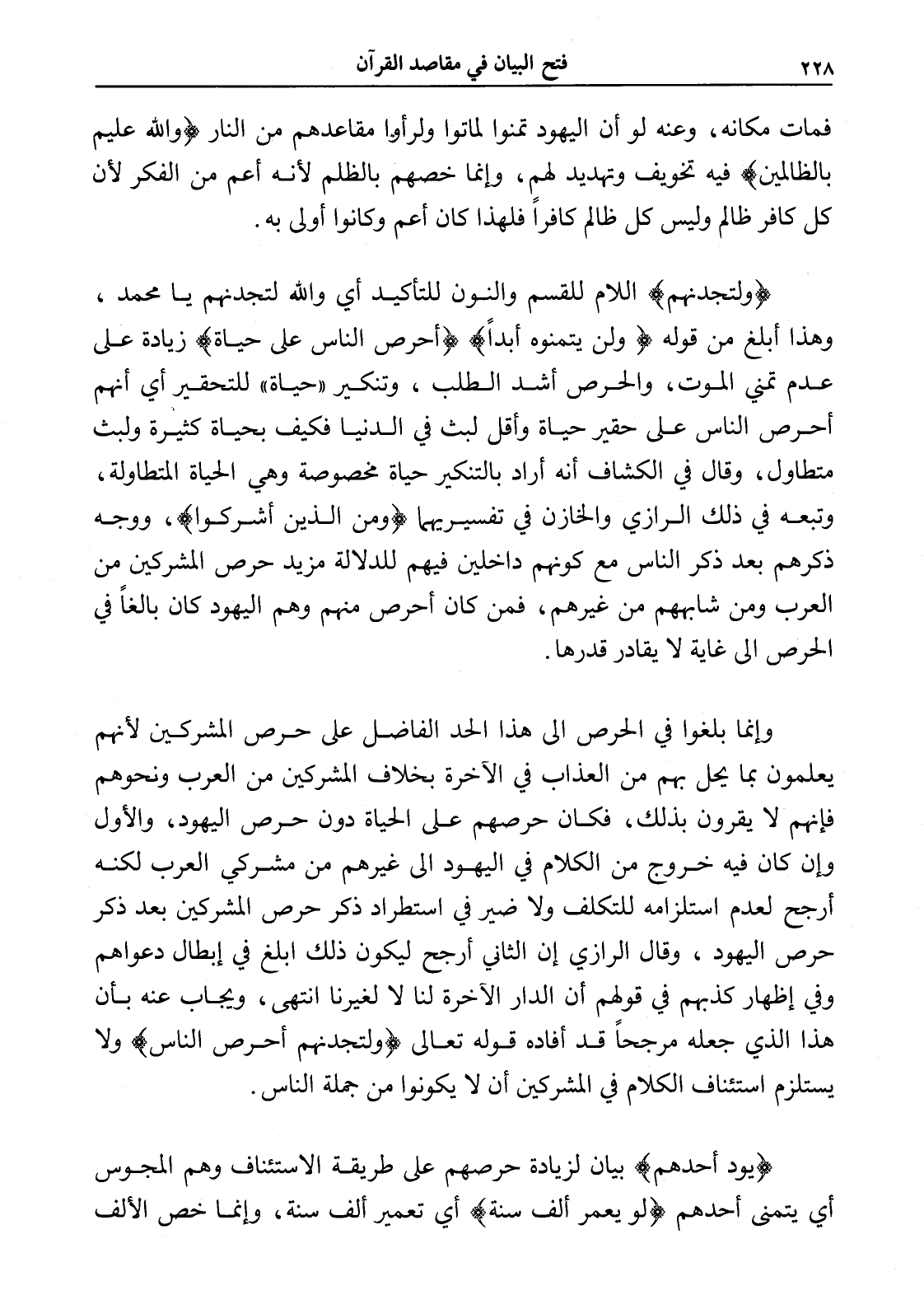 (ولتجدنهم) اللام للقسم والنون للتأكيد أي والله لتجدنهم يا محمد، وهذا أبلغ من قوله (ولن يتمنوه أبداً) (أحرص الناس على حياة) زيادة على عدم تمني الموت، والحرص أشد الطلب، وتنكير " حياة " للتحقير أي أنهم أحرص الناس على حقير حياة وأقل لبث في الدنيا فكيف بحياة كثيرة ولبث متطاول، وقال في الكشاف أنه أراد بالتنكير حياة مخصوصة وهي الحياة المتطاولة، وتبعه في ذلك الرازي والخازن في تفسيريهما (ومن الذين أشركوا)، ووجه ذكرهم بعد ذكر الناس مع كونهم داخلين فيهم للدلالة مزيد حرص المشركين من العرب ومن شابههم من غيرهم، فمن كان أحرص منهم وهم اليهود كان بالغاً في الحرص إلى غاية لا يقادر قدرها.