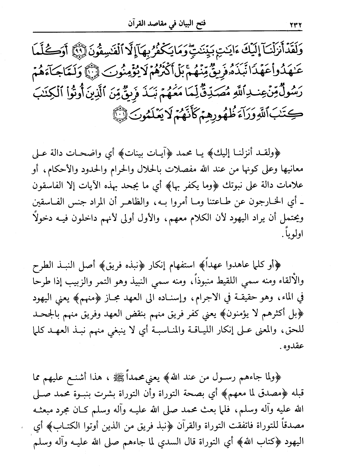 وَلَقَدْ أَنْزَلْنَا إِلَيْكَ آَيَاتٍ بَيِّنَاتٍ وَمَا يَكْفُرُ بِهَا إِلَّا الْفَاسِقُونَ (99) أَوَكُلَّمَا عَاهَدُوا عَهْدًا نَبَذَهُ فَرِيقٌ مِنْهُمْ بَلْ أَكْثَرُهُمْ لَا يُؤْمِنُونَ (100) وَلَمَّا جَاءَهُمْ رَسُولٌ مِنْ عِنْدِ اللَّهِ مُصَدِّقٌ لِمَا مَعَهُمْ نَبَذَ فَرِيقٌ مِنَ الَّذِينَ أُوتُوا الْكِتَابَ كِتَابَ اللَّهِ وَرَاءَ ظُهُورِهِمْ كَأَنَّهُمْ لَا يَعْلَمُونَ (101)