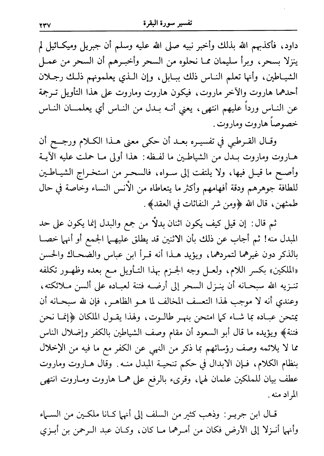 وقال القرطبي في تفسيره بعد أن حكى معنى هذا الكلام ورجح أن هاروت وماروت بدل من الشياطين ما لفظه: هذا أولى ما حملت عليه الآية وأصح ما قيل فيها، ولا يلتفت إلى سواه، فالسحر من استخراج الشياطين للطافة جوهرهم ودقة أفهامهم وأكثر ما يتعاطاه من الأنس النساء وخاصة في حال طمثهن، قال الله (ومن شر النفاثات في العقد).