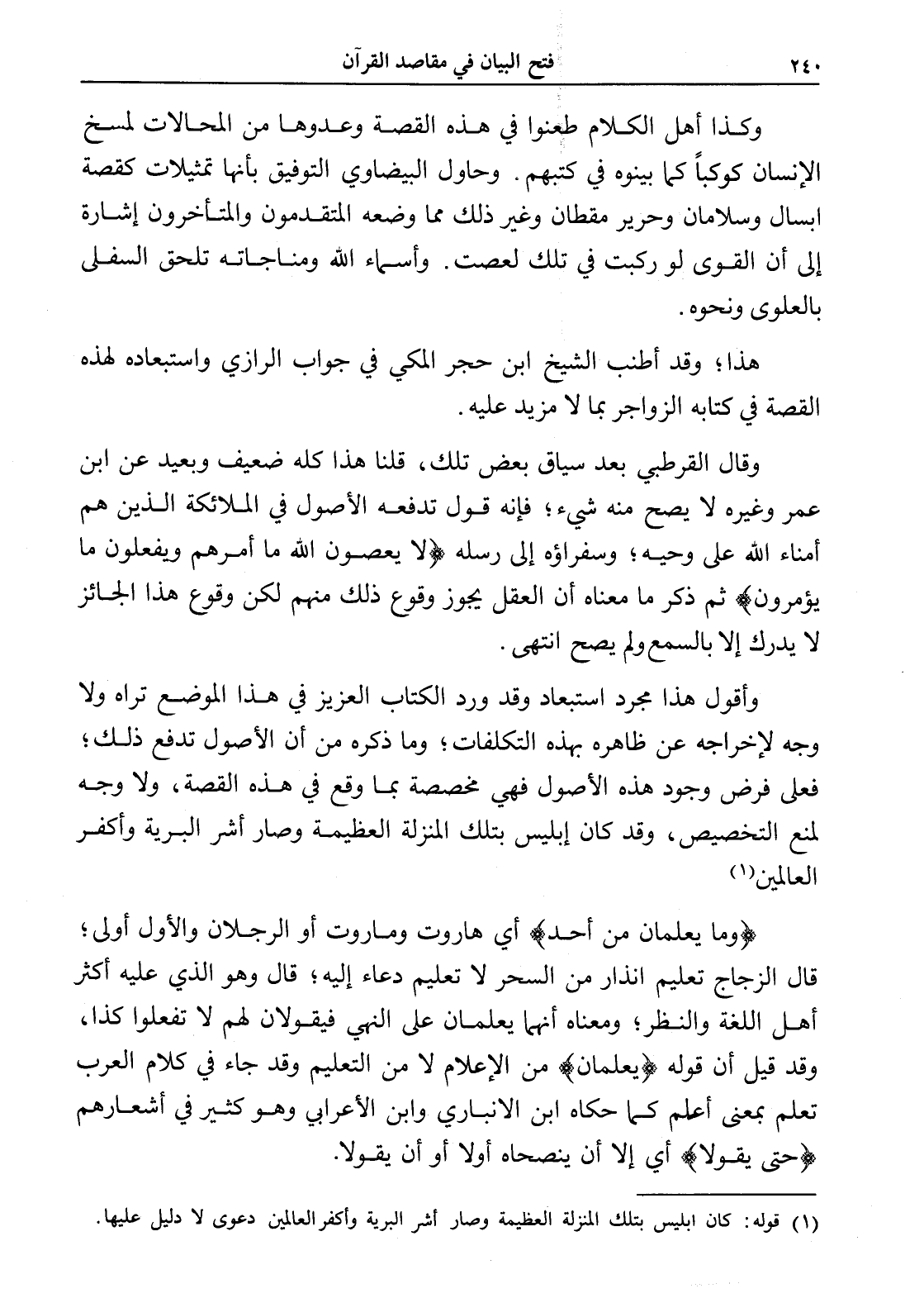 وقال القرطبي بعد سياق بعض تلك، قلنا هذا كله ضعيف وبعيد عن ابن عمر وغيره لا يصح منه شيء؛ فإنه قول تدفعه الأصول في الملائكة الذين هم أمناء الله على وحيه؛ وسفراؤه إلى رسله (ولا يعصون الله ما أمرهم ويفعلون ما يؤمرون) ثم ذكر ما معناه أن العقل يجوز وقوع ذلك منهم لكن وقوع هذا الجائز لا يدرك إلا بالسمع ولم يصح انتهى.
