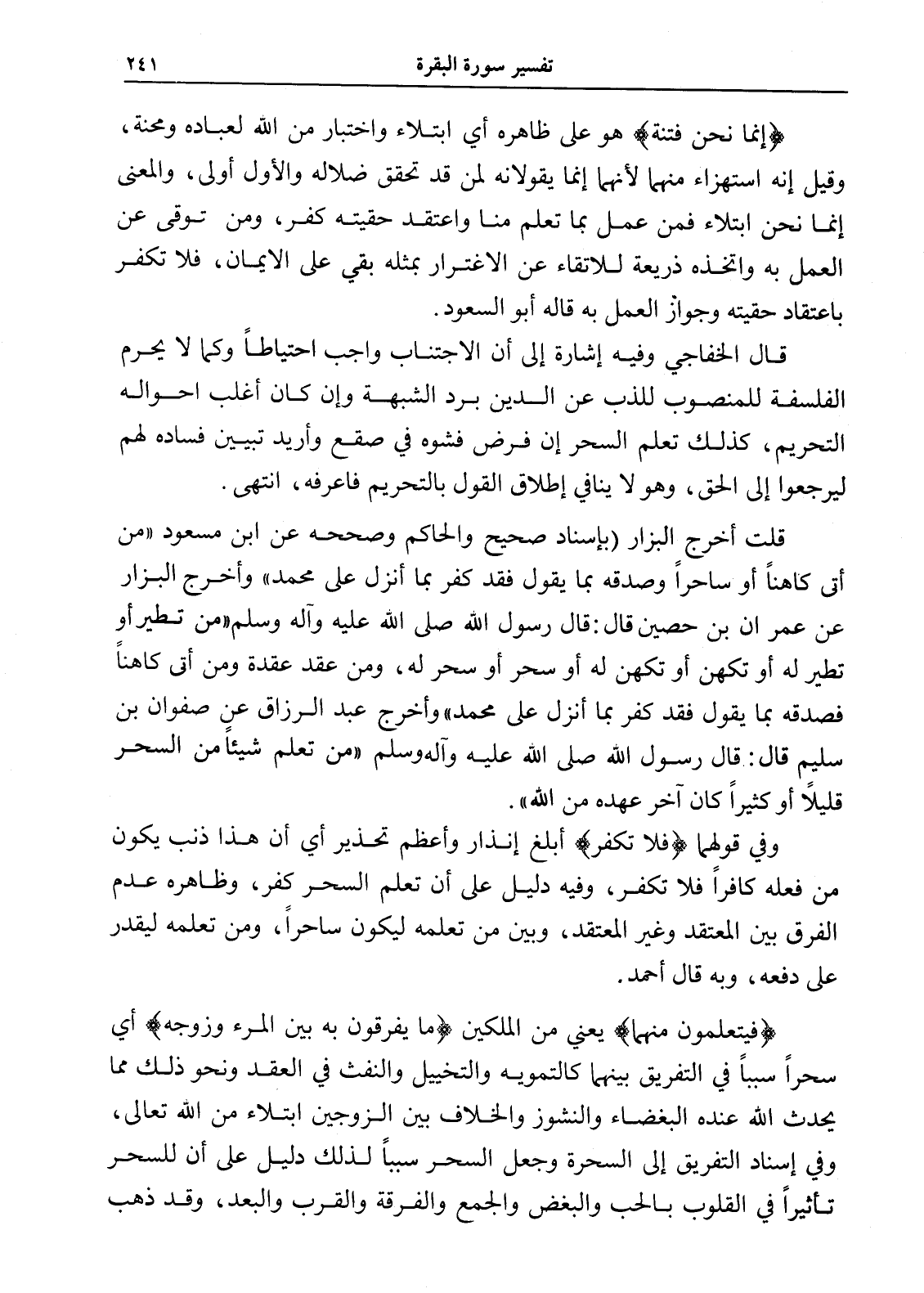 قلت أخرج البزار (بإسناد صحيح والحاكم وصححه عن ابن مسعود " من أتى كاهناً أو ساحراً وصدقه بما يقول فقد كفر بما أنزل على محمد " وأخرج البزار عن عمران بن حصين قال: قال رسول الله صلى الله عليه وآله وسلم " من تطير أو تطير له أو تكهن أو تكهن له أو سحر أو سحر له، ومن عقد عقدة ومن أتى كاهناً فصدقه بما يقول فقد كفر بما أنزل على محمد " وأخرج عبد الرزاق عن صفوان بن سليم قال: قال رسول الله صلى الله عليه وآله وسلم " من تعلم شيئاً من السحر قليلاً أو كثيراً كان آخر عهده من الله ".