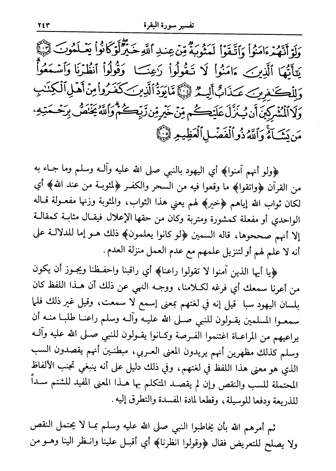 وَلَوْ أَنَّهُمْ آَمَنُوا وَاتَّقَوْا لَمَثُوبَةٌ مِنْ عِنْدِ اللَّهِ خَيْرٌ لَوْ كَانُوا يَعْلَمُونَ (103) يَا أَيُّهَا الَّذِينَ آَمَنُوا لَا تَقُولُوا رَاعِنَا وَقُولُوا انْظُرْنَا وَاسْمَعُوا وَلِلْكَافِرِينَ عَذَابٌ أَلِيمٌ (104) مَا يَوَدُّ الَّذِينَ كَفَرُوا مِنْ أَهْلِ الْكِتَابِ وَلَا الْمُشْرِكِينَ أَنْ يُنَزَّلَ عَلَيْكُمْ مِنْ خَيْرٍ مِنْ رَبِّكُمْ وَاللَّهُ يَخْتَصُّ بِرَحْمَتِهِ مَنْ يَشَاءُ وَاللَّهُ ذُو الْفَضْلِ الْعَظِيمِ (105)