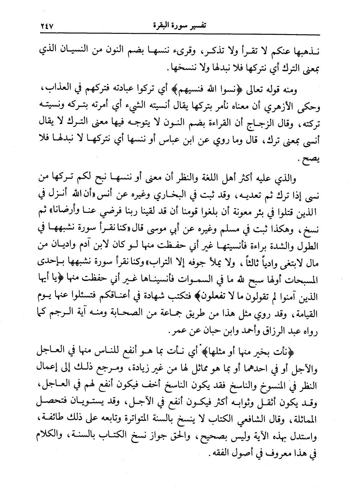 والذي عليه أكثر أهل اللغة والنظر أن معنى أو ننسها نبح لكم تركها من نسى إذا ترك ثم تعديه، وقد ثبت في البخاري وغيره عن أنس " أن الله أنزل في الذين قتلوا في بئر معونة أن بلغوا قومنا أن قد لقينا ربنا فرضي عنا وأرضانا " ثم نسخ، وهكذا ثبت في مسلم وغيره عن أبي موسى قال " كنا نقرأ سورة نشبهها في الطول والشدة براءة فانسيتها غير أني حفظت منها لو كان لابن آدم واديان من مال لابتغى وادياً ثالثاً، ولا يملأ جوفه إلا التراب " وكنا نقرأ سورة نشبهها بإحدى المسبحات أولها سبح لله ما في السموات فأنسيناها غير أني حفظت منها (يا أيها الذين آمنوا لم تقولون ما لا تفعلون) فتكتب شهادة في أعناقكم فتسئلوا عنها يوم القيامة، وقد روي مثل هذا من طريق جماعة من الصحابة ومنه آية الرجم كما رواه عبد الرزاق وأحمد وابن حبان عن عمر.