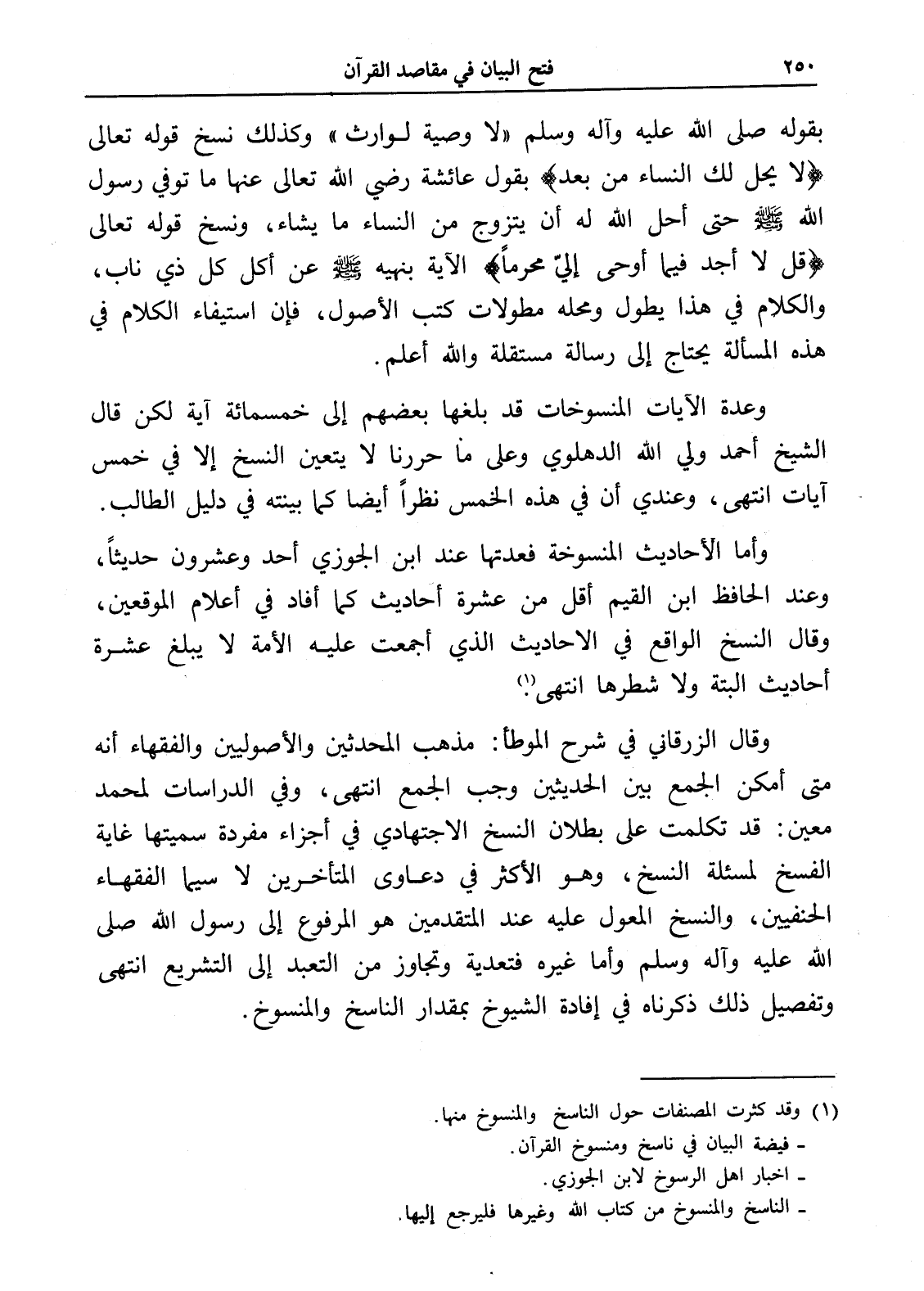 وعدة الآيات المنسوخات قد بلغها بعضهم إلى خمسمائة آية لكن قال الشيخ أحمد ولي الله الدهلوي وعلى ما حررنا لا يتعين النسخ إلا في خمس آيات انتهى، وعندي أن في هذه الخمس نظراً أيضاً كما بينته في دليل الطالب.