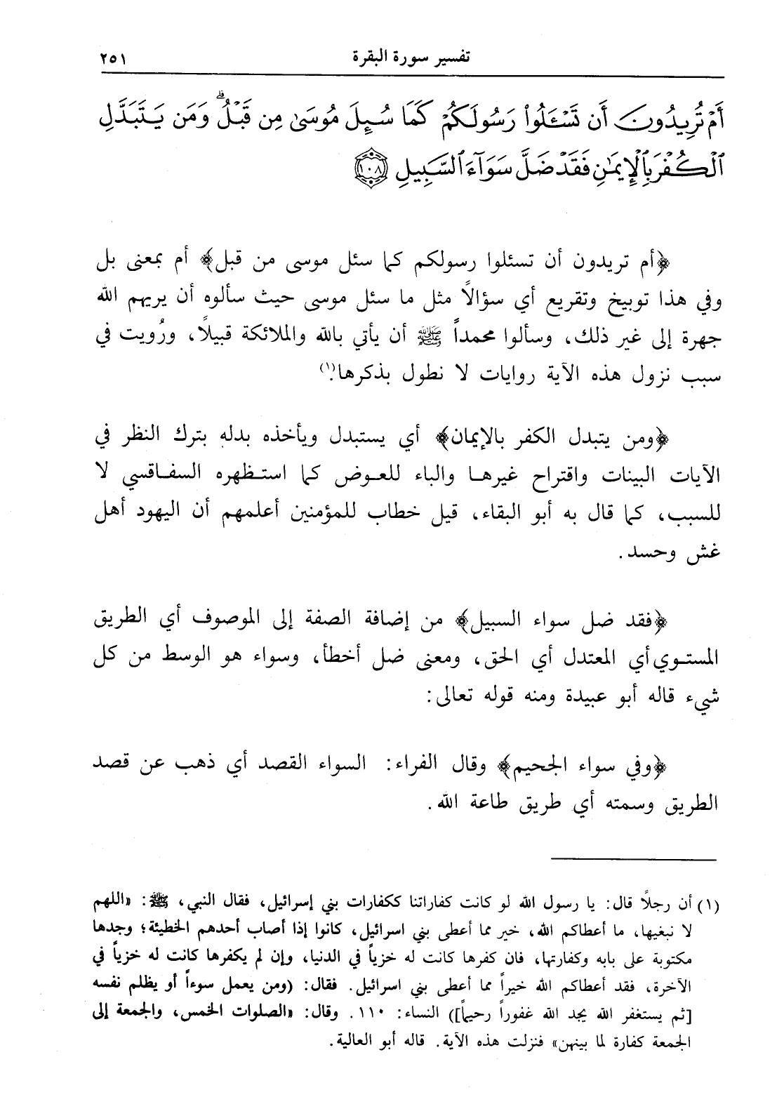 أَمْ تُرِيدُونَ أَنْ تَسْأَلُوا رَسُولَكُمْ كَمَا سُئِلَ مُوسَى مِنْ قَبْلُ وَمَنْ يَتَبَدَّلِ الْكُفْرَ بِالْإِيمَانِ فَقَدْ ضَلَّ سَوَاءَ السَّبِيلِ (108)