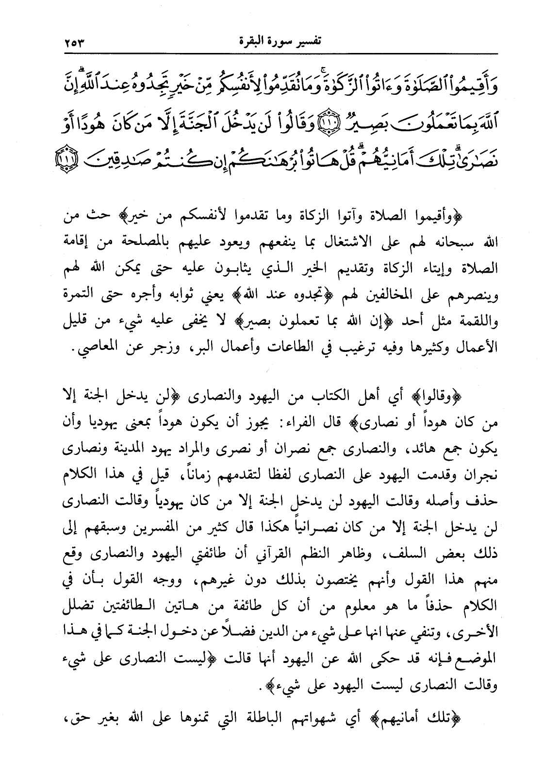 وَأَقِيمُوا الصَّلَاةَ وَآَتُوا الزَّكَاةَ وَمَا تُقَدِّمُوا لِأَنْفُسِكُمْ مِنْ خَيْرٍ تَجِدُوهُ عِنْدَ اللَّهِ إِنَّ اللَّهَ بِمَا تَعْمَلُونَ بَصِيرٌ (110) وَقَالُوا لَنْ يَدْخُلَ الْجَنَّةَ إِلَّا مَنْ كَانَ هُودًا أَوْ نَصَارَى تِلْكَ أَمَانِيُّهُمْ قُلْ هَاتُوا بُرْهَانَكُمْ إِنْ كُنْتُمْ صَادِقِينَ (111)