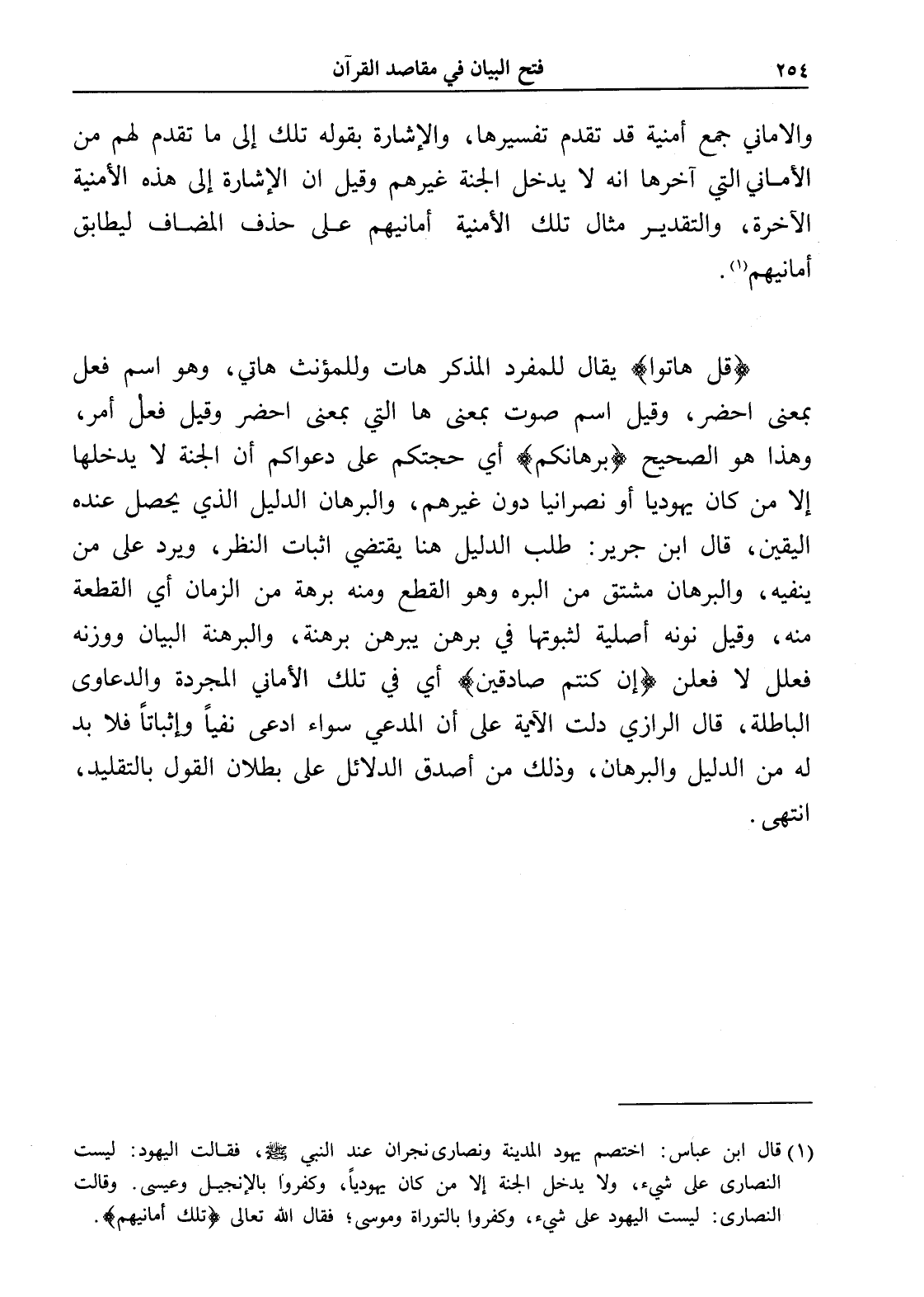 (قل هاتوا) يقال للمفرد المذكر هات وللمؤنث هاتي، وهو اسم فعل بمعنى احضر، وقيل اسم صوت بمعنى ها التي بمعنى احضر وقيل فعل أمر، وهذا هو الصحيح (برهانكم) أي حجتكم على دعواكم أن الجنة لا يدخلها إلا من كان يهودياً أو نصرانياً دون غيرهم، والبرهان الدليل الذي يحصل عنده اليقين، قال ابن جرير: طلب الدليل هنا يقتضي إثبات النظر، ويرد على من ينفيه، والبرهان مشتق من البره وهو القطع ومنه برهة من الزمان أي القطعة منه، وقيل نونه أصلية لثبوتها في برهن يبرهن برهنة، والبرهنة البيان ووزنه فعلل لا فعلن (إن كنتم صادقين) أي في تلك الأماني المجردة والدعاوى الباطلة، قال الرازي دلت الآية على أن المدعي سواء ادعى نفياً وإثباتاً فلابد له من الدليل والبرهان، وذلك من أصدق الدلائل على بطلان القول بالتقليد، انتهى.