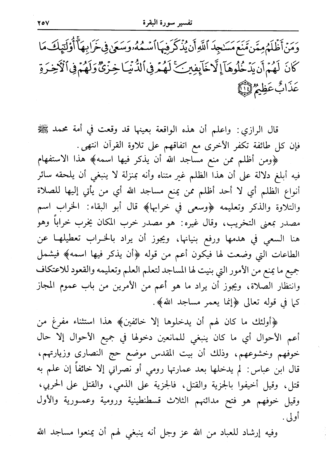 وَمَنْ أَظْلَمُ مِمَّنْ مَنَعَ مَسَاجِدَ اللَّهِ أَنْ يُذْكَرَ فِيهَا اسْمُهُ وَسَعَى فِي خَرَابِهَا أُولَئِكَ مَا كَانَ لَهُمْ أَنْ يَدْخُلُوهَا إِلَّا خَائِفِينَ لَهُمْ فِي الدُّنْيَا خِزْيٌ وَلَهُمْ فِي الْآَخِرَةِ عَذَابٌ عَظِيمٌ (114)