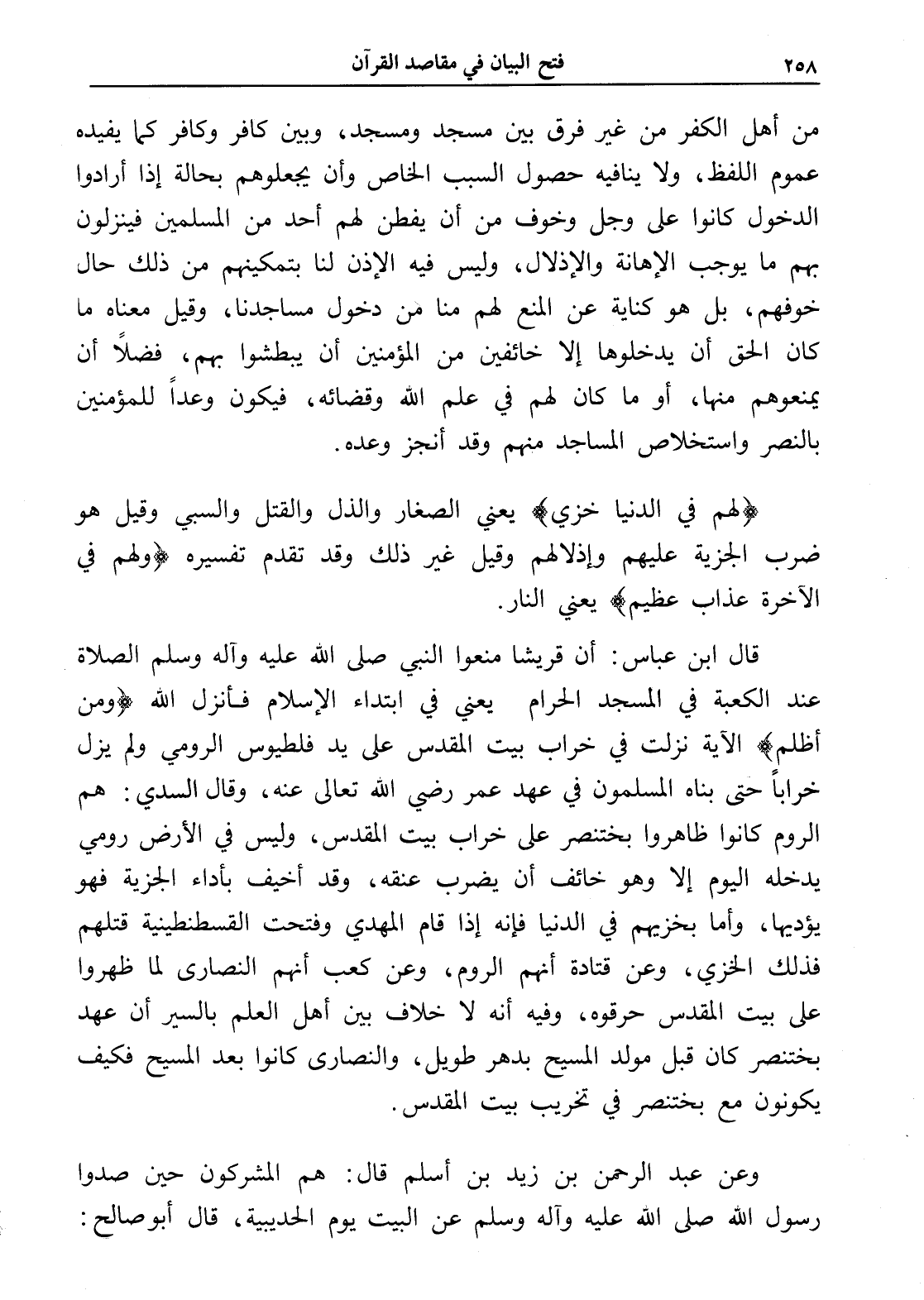 قال ابن عباس: أن قريشاً منعوا النبي صلى الله عليه وآله وسلم الصلاة عند الكعبة في المسجد الحرام يعني في ابتداء الإسلام فأنزل الله (ومن أظلم) الآية نزلت في خراب بيت المقدس على يد فلطيوس الرومي ولم يزل خراباً حتى بناه المسلمون في عهد عمر رضي الله تعالى عنه، وقال السدي: هم الروم كانوا ظاهروا بختنصر على خراب بيت المقدس، وليس في الأرض رومي يدخله اليوم إلا وهو خائف أن يضرب عنقه، وقد أخيف بأداء الجزية فهو يؤديها، وأما بخزيهم في الدنيا فإنه إذا قام المهدي وفتحت القسطنطينية قتلهم فذلك الخزي، وعن قتادة أنهم الروم، وعن كعب أنهم النصارى لما ظهروا على بيت المقدس حرقوه، وفيه أنه لا خلاف بين أهل العلم بالسير أن عهد بختنصر كان قبل مولد المسيح بدهر طويل، والنصارى كانوا بعد المسيح فكيف يكونون مع بختنصر في تخريب بيت المقدس.