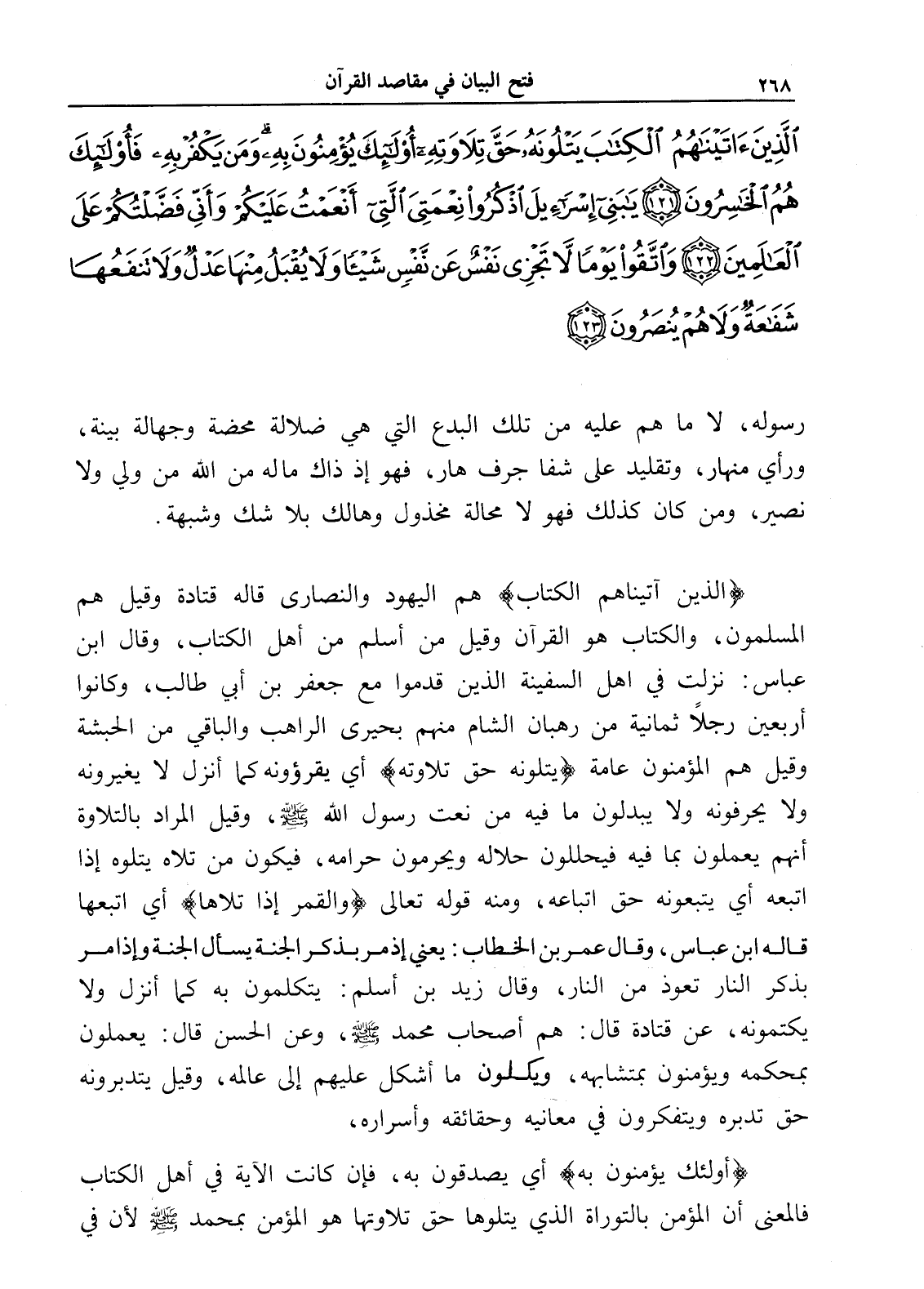 الَّذِينَ آَتَيْنَاهُمُ الْكِتَابَ يَتْلُونَهُ حَقَّ تِلَاوَتِهِ أُولَئِكَ يُؤْمِنُونَ بِهِ وَمَنْ يَكْفُرْ بِهِ فَأُولَئِكَ هُمُ الْخَاسِرُونَ (121) يَا بَنِي إِسْرَائِيلَ اذْكُرُوا نِعْمَتِيَ الَّتِي أَنْعَمْتُ عَلَيْكُمْ وَأَنِّي فَضَّلْتُكُمْ عَلَى الْعَالَمِينَ (122) وَاتَّقُوا يَوْمًا لَا تَجْزِي نَفْسٌ عَنْ نَفْسٍ شَيْئًا وَلَا يُقْبَلُ مِنْهَا عَدْلٌ وَلَا تَنْفَعُهَا شَفَاعَةٌ وَلَا هُمْ يُنْصَرُونَ (123)
