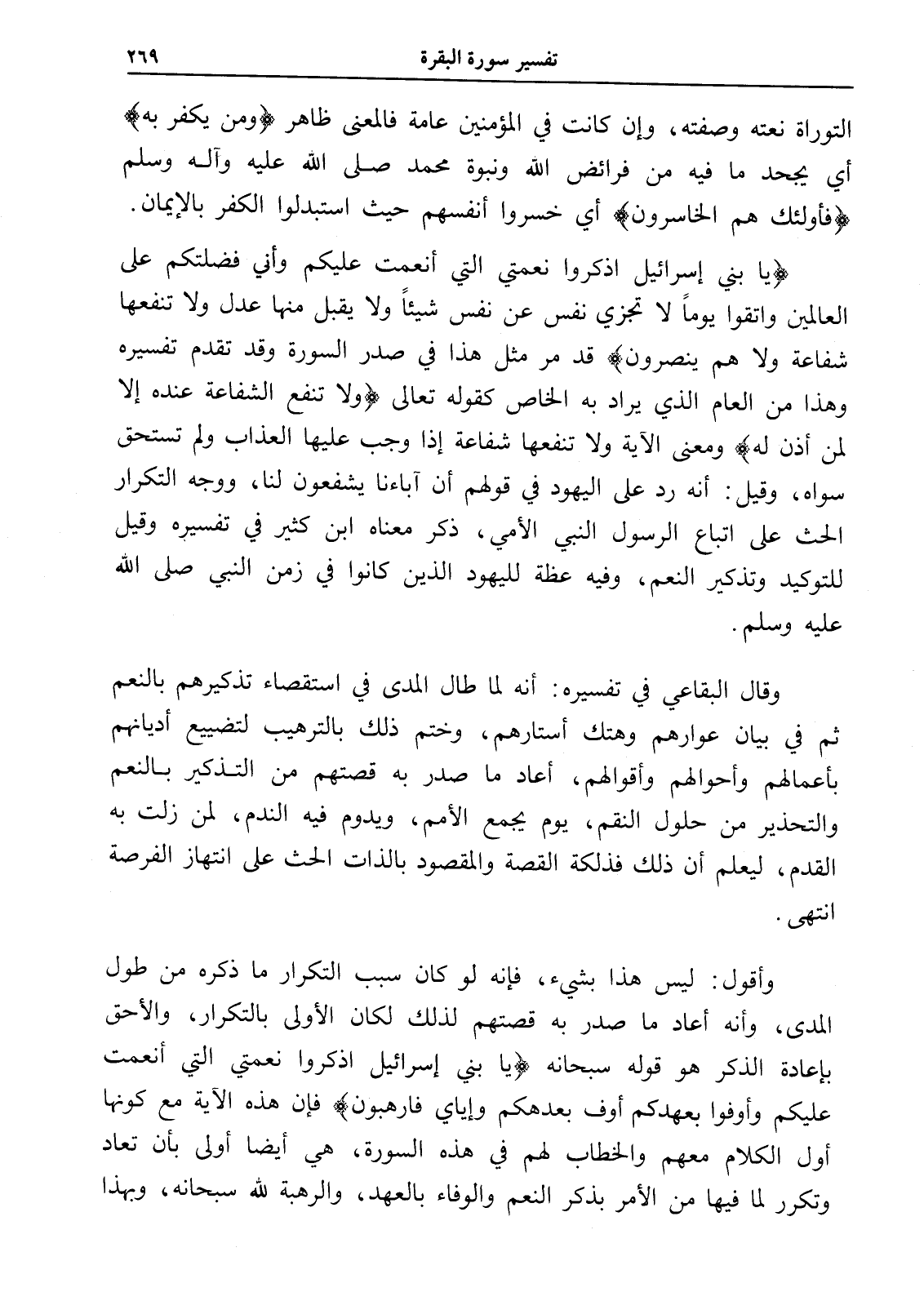 (يا بني إسرائيل اذكروا نعمتي التي أنعمت عليكم وأني فضلتكم على العالمين واتقوا يوماً لا تجزي نفس عن نفس شيئاً ولا يقبل منها عدل ولا تنفعها شفاعة ولا هم ينصرون) قد مر مثل هذا في صدر السورة وقد تقدم تفسيره وهذا من العام الذي يراد به الخاص كقوله تعالى (ولا تنفع الشفاعة عنده إلا لمن أذن له) ومعنى الآية ولا تنفعها شفاعة إذا وجب عليها العذاب ولم تستحق سواه، وقيل: أنه رد على اليهود في قولهم أن آباءنا يشفعون لنا، ووجه التكرار الحث على اتباع الرسول النبي الأمي، ذكر معناه ابن كثير في تفسيره وقيل للتوكيد وتذكير النعم، وفيه عظة لليهود الذين كانوا في زمن النبي صلى الله عليه وسلم.