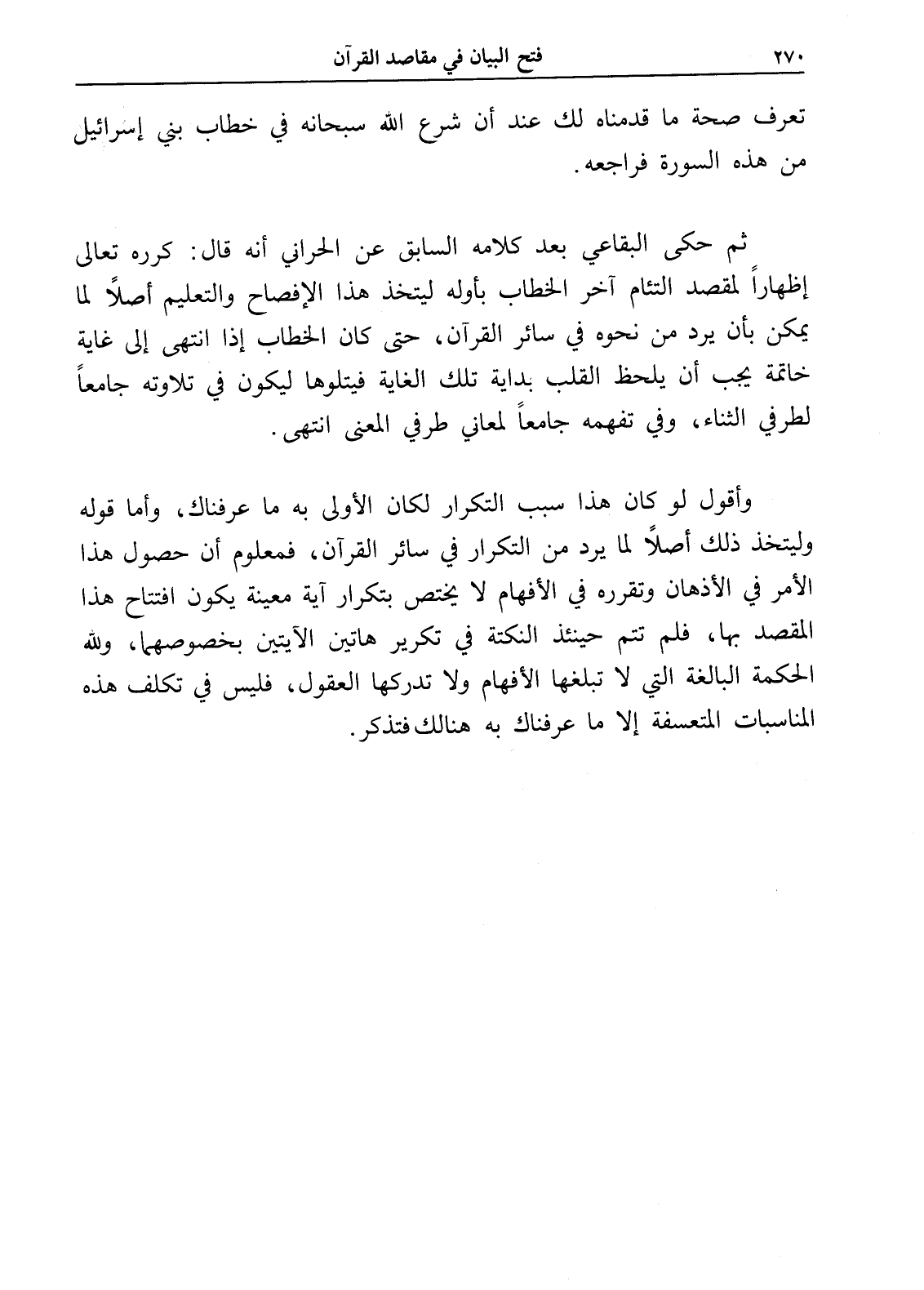 وأقول لو كان هذا سبب التكرار لكان الأولى به ما عرفناك، وأما قوله وليتخذ ذلك أصلاً لما يرد من التكرار في سائر القرآن، فمعلوم أن حصول هذا الأمر في الأذهان وتقرره في الأفهام لا يختص بتكرار آية معينة يكون افتتاح هذا المقصد بها، فلم تتم حينئذ النكتة في تكرير هاتين الآيتين بخصوصهما، ولله الحكمة البالغة التي لا تبلغها الأفهام ولا تدركها العقول، فليس في تكلف هذه المناسبات المتعسفة إلا ما عرفناك به هنالك فتذكر.