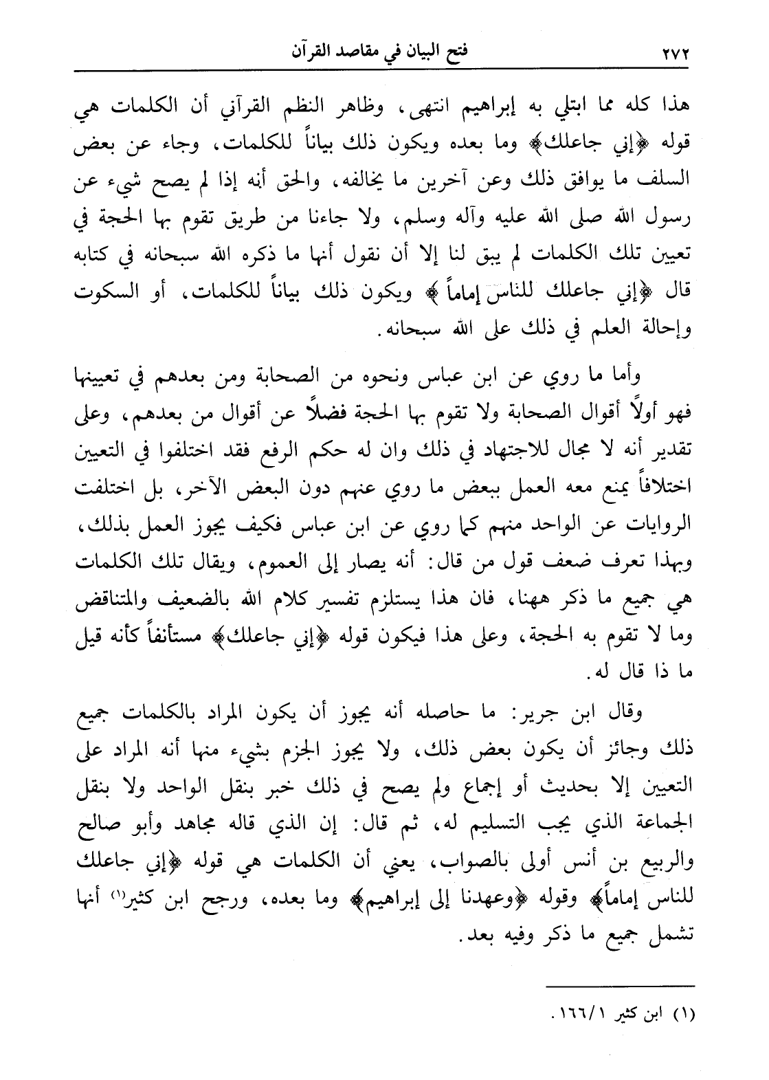 وقال ابن جرير: ما حاصله أنه يجوز أن يكون المراد بالكلمات جميع ذلك وجائز أن يكون بعض ذلك، ولا يجوز الجزم بشيء منها أنه المراد على التعيين إلا بحديث أو إجماع ولم يصح في ذلك خبر بنقل الواحد ولا بنقل الجماعة الذي يجب التسليم له، ثم قال: إن الذي قاله مجاهد وأبو صالح والربيع بن أنس أولى بالصواب، يعني أن الكلمات هي قوله (إني جاعلك للناس إماماً) وقوله (وعهدنا إلى إبراهيم) وما بعده، ورجح ابن كثير (¬1) أنها تشمل جميع ما ذكر وفيه بعد.