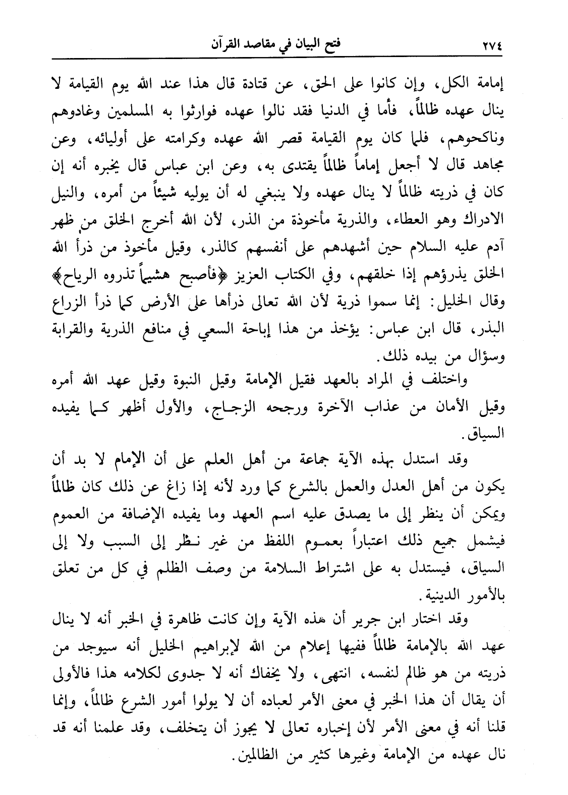 وقد اختار ابن جرير أن هذه الآية وإن كانت ظاهرة في الخبر أنه لا ينال عهد الله بالإمامة ظالماً ففيها إعلام من الله لإبراهيم الخليل أنه سيوجد من ذريته من هو ظالم لنفسه، انتهى، ولا يخفاك أنه لا جدوى لكلامه هذا فالأولى أن يقال أن هذا الخبر في معنى الأمر لعباده أن لا يولوا أمور الشرع ظالماً، وإنما قلنا أنه في معنى الأمر لأن إخباره تعالى لا يجوز أن يتخلف، وقد علمنا أنه قد نال عهده من الإمامة وغيرها كثير من الظالمين.
