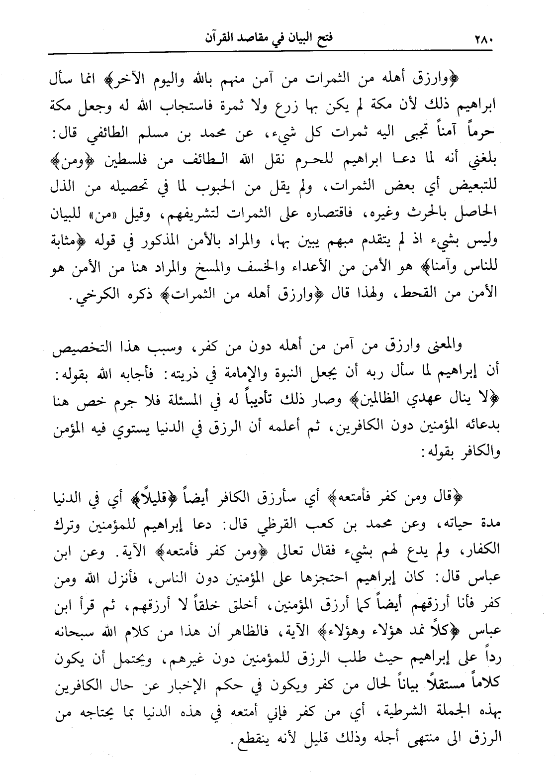 (وارزق أهله من الثمرات من آمن منهم بالله واليوم الآخر) إنما سأل إبراهيم ذلك لأن مكة لم يكن بها زرع ولا ثمرة فاستجاب الله له وجعل مكة حرماً آمناً تجبى إليه ثمرات كل شيء، عن محمد بن مسلم الطائفي قال: بلغني أنه لما دعا إبراهيم للحرم نقل الله الطائف من فلسطين (ومن) للتبعيض أي بعض الثمرات، ولم يقل من الحبوب لما في تحصيله من الذل الحاصل بالحرث وغيره، فاقتصاره على الثمرات لتشريفهم، وقيل " من " للبيان وليس بشيء إذ لم يتقدم مبهم يبين بها، والمراد بالأمن المذكور في قوله (مثابة للناس وآمنا) هو الأمن من الأعداء والخسف والمسخ والمراد هنا من الأمن هو الأمن من القحط، ولهذا قال (وارزق أهله من الثمرات) ذكره الكرخي.
