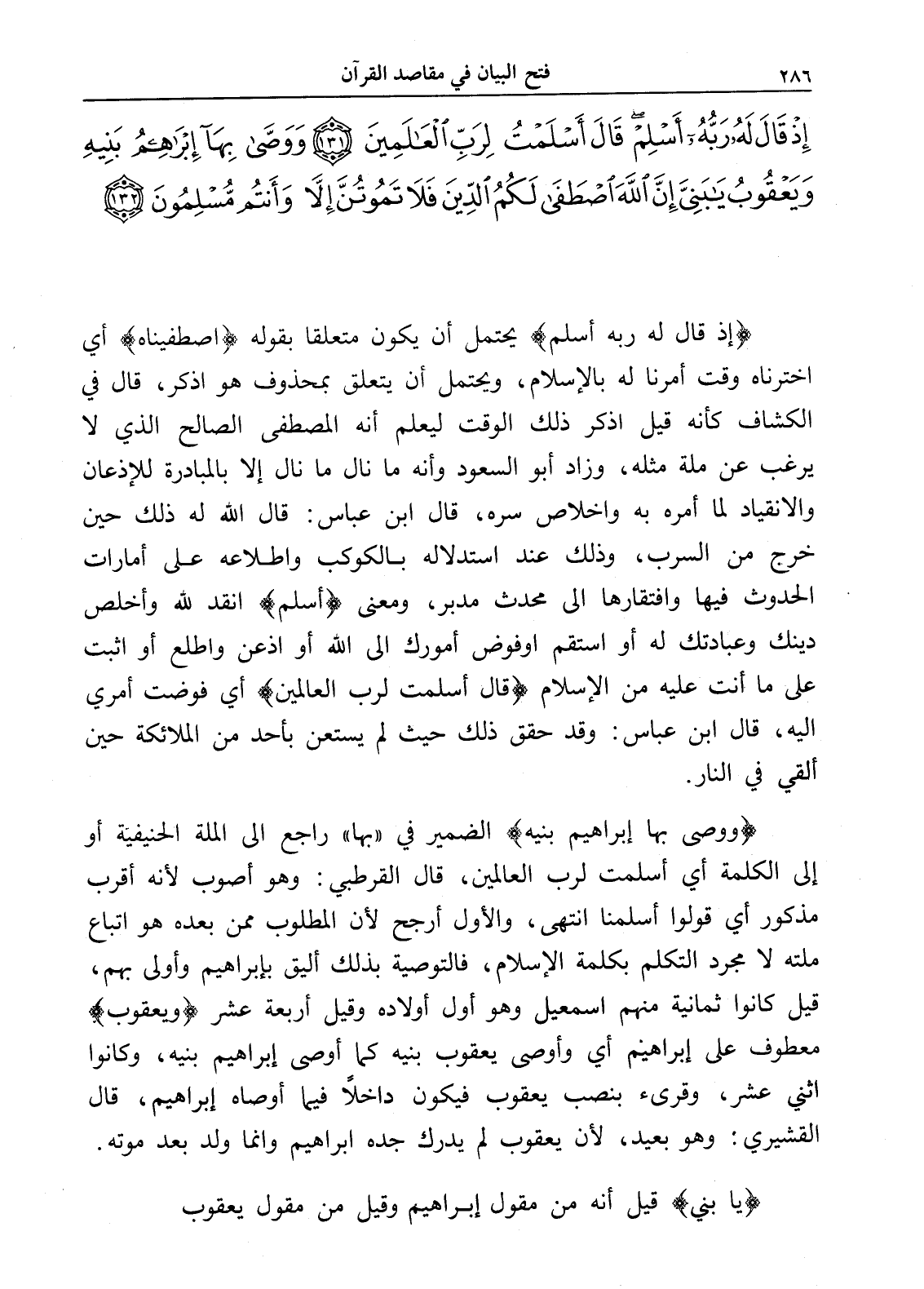 إِذْ قَالَ لَهُ رَبُّهُ أَسْلِمْ قَالَ أَسْلَمْتُ لِرَبِّ الْعَالَمِينَ (131) وَوَصَّى بِهَا إِبْرَاهِيمُ بَنِيهِ وَيَعْقُوبُ يَا بَنِيَّ إِنَّ اللَّهَ اصْطَفَى لَكُمُ الدِّينَ فَلَا تَمُوتُنَّ إِلَّا وَأَنْتُمْ مُسْلِمُونَ (132)