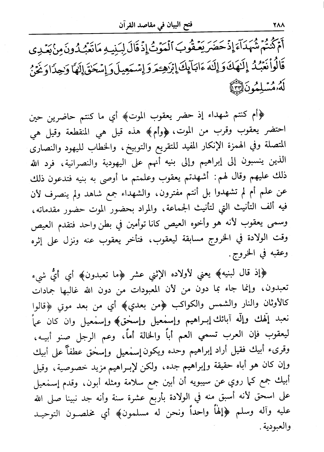 أَمْ كُنْتُمْ شُهَدَاءَ إِذْ حَضَرَ يَعْقُوبَ الْمَوْتُ إِذْ قَالَ لِبَنِيهِ مَا تَعْبُدُونَ مِنْ بَعْدِي قَالُوا نَعْبُدُ إِلَهَكَ وَإِلَهَ آَبَائِكَ إِبْرَاهِيمَ وَإِسْمَاعِيلَ وَإِسْحَاقَ إِلَهًا وَاحِدًا وَنَحْنُ لَهُ مُسْلِمُونَ (133)
