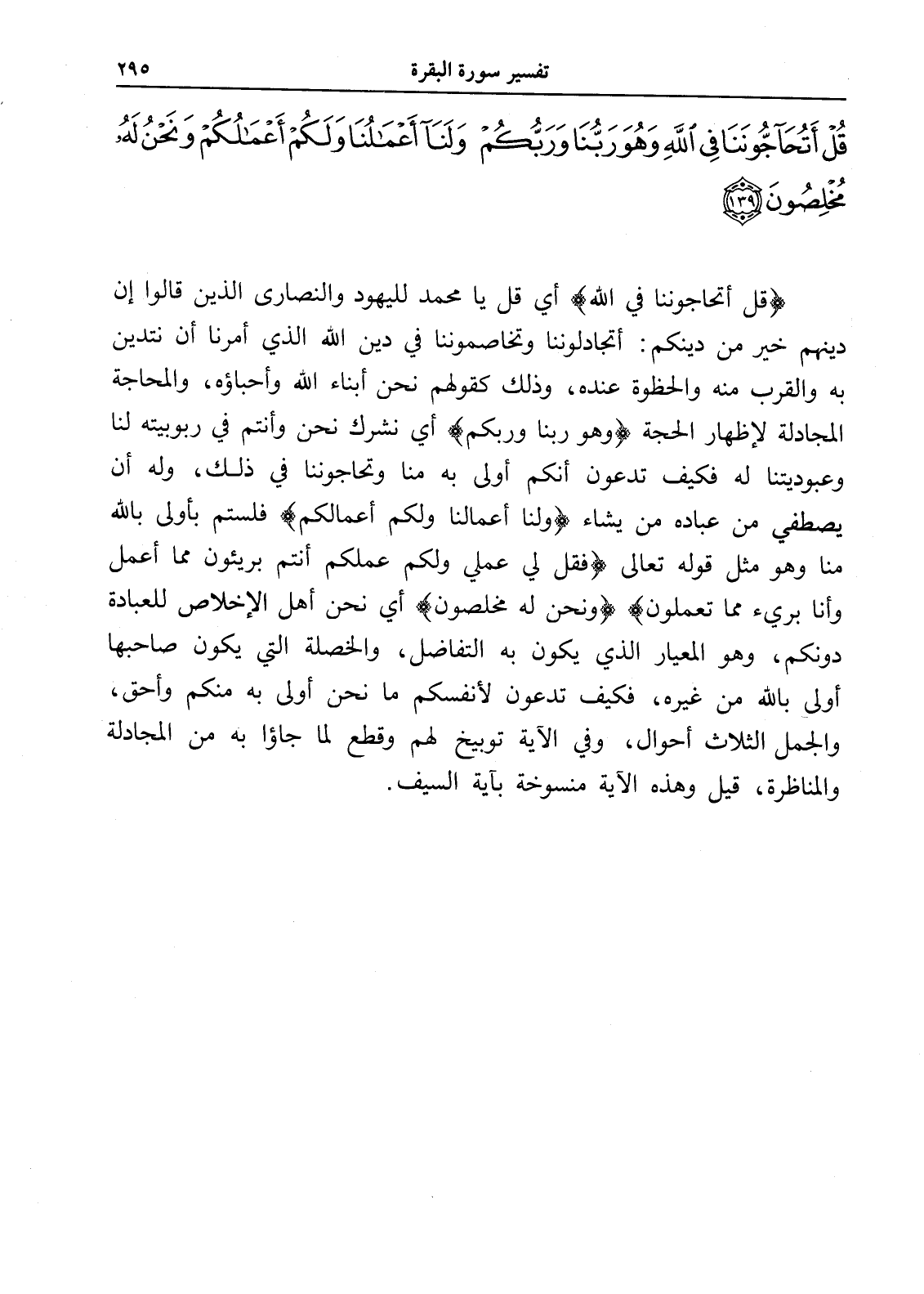 قُلْ أَتُحَاجُّونَنَا فِي اللَّهِ وَهُوَ رَبُّنَا وَرَبُّكُمْ وَلَنَا أَعْمَالُنَا وَلَكُمْ أَعْمَالُكُمْ وَنَحْنُ لَهُ مُخْلِصُونَ (139)