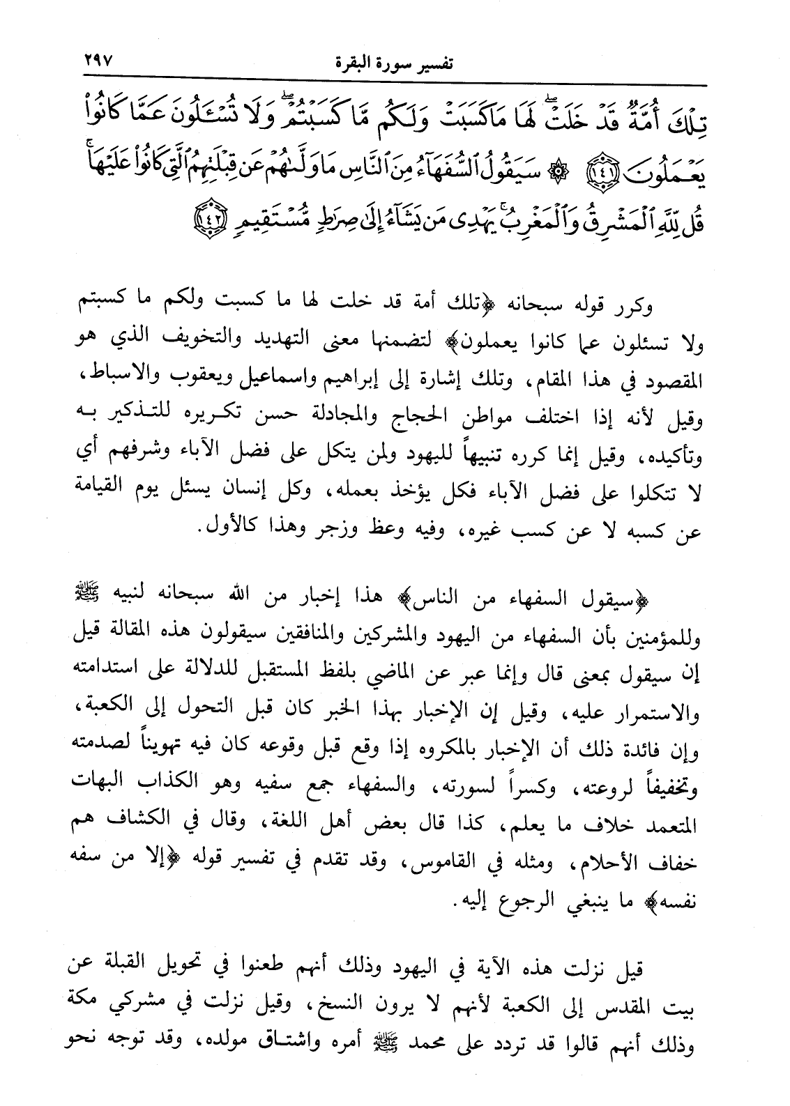 تِلْكَ أُمَّةٌ قَدْ خَلَتْ لَهَا مَا كَسَبَتْ وَلَكُمْ مَا كَسَبْتُمْ وَلَا تُسْأَلُونَ عَمَّا كَانُوا يَعْمَلُونَ (141) سَيَقُولُ السُّفَهَاءُ مِنَ النَّاسِ مَا وَلَّاهُمْ عَنْ قِبْلَتِهِمُ الَّتِي كَانُوا عَلَيْهَا قُلْ لِلَّهِ الْمَشْرِقُ وَالْمَغْرِبُ يَهْدِي مَنْ يَشَاءُ إِلَى صِرَاطٍ مُسْتَقِيمٍ (142)