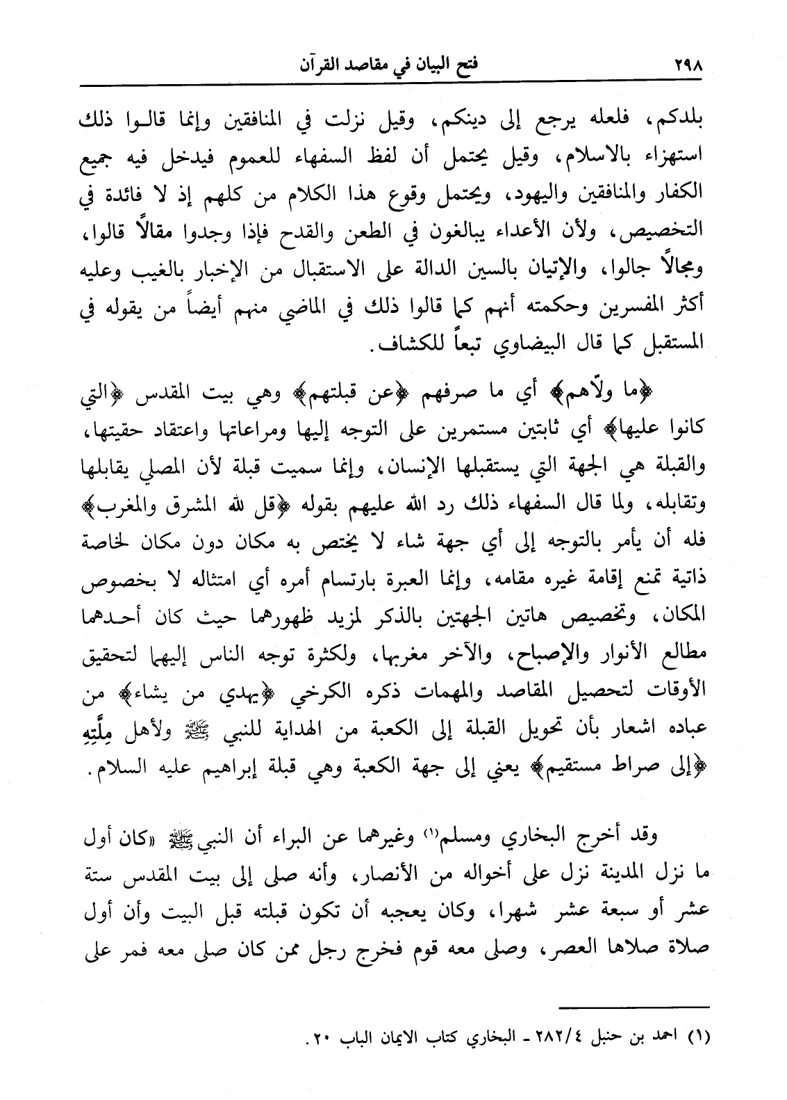 (ما ولاّهم) أي ما صرفهم (عن قبلتهم) وهي بيت المقدس (التي كانوا عليها) أي ثابتين مستمرين على التوجه إليها ومراعاتها واعتقاد حقيتها، والقبلة هي الجهة التي يستقبلها الإنسان، وإنما سميت قبلة لأن المصلي يقابلها وتقابله، ولما قال السفهاء ذلك رد الله عليهم بقوله (قل لله المشرق والمغرب) فله أن يأمر بالتوجه إلى أي جهة شاء لا يختص به مكان دون مكان لخاصة ذاتية تمنع إقامة غيره مقامه، وإنما العبرة بارتسام أمره أي امتثاله لا بخصوص المكان، وتخصيص هاتين الجهتين بالذكر لمزيد ظهورهما حيث كان أحدهما مطالع الأنوار والإصباح، والآخر مغربها، ولكثرة توجه الناس إليهما لتحقيق الأوقات لتحصيل المقاصد والمهمات ذكره الكرخي (يهدي من يشاء) من عباده إشعار بأن تحويل القبلة إلى الكعبة من الهداية للنبي - صلى الله عليه وسلم - ولأهل مِلَّتِهِ (إلى صراط مستقيم) يعني إلى جهة الكعبة وهي قبلة إبراهيم عليه السلام.